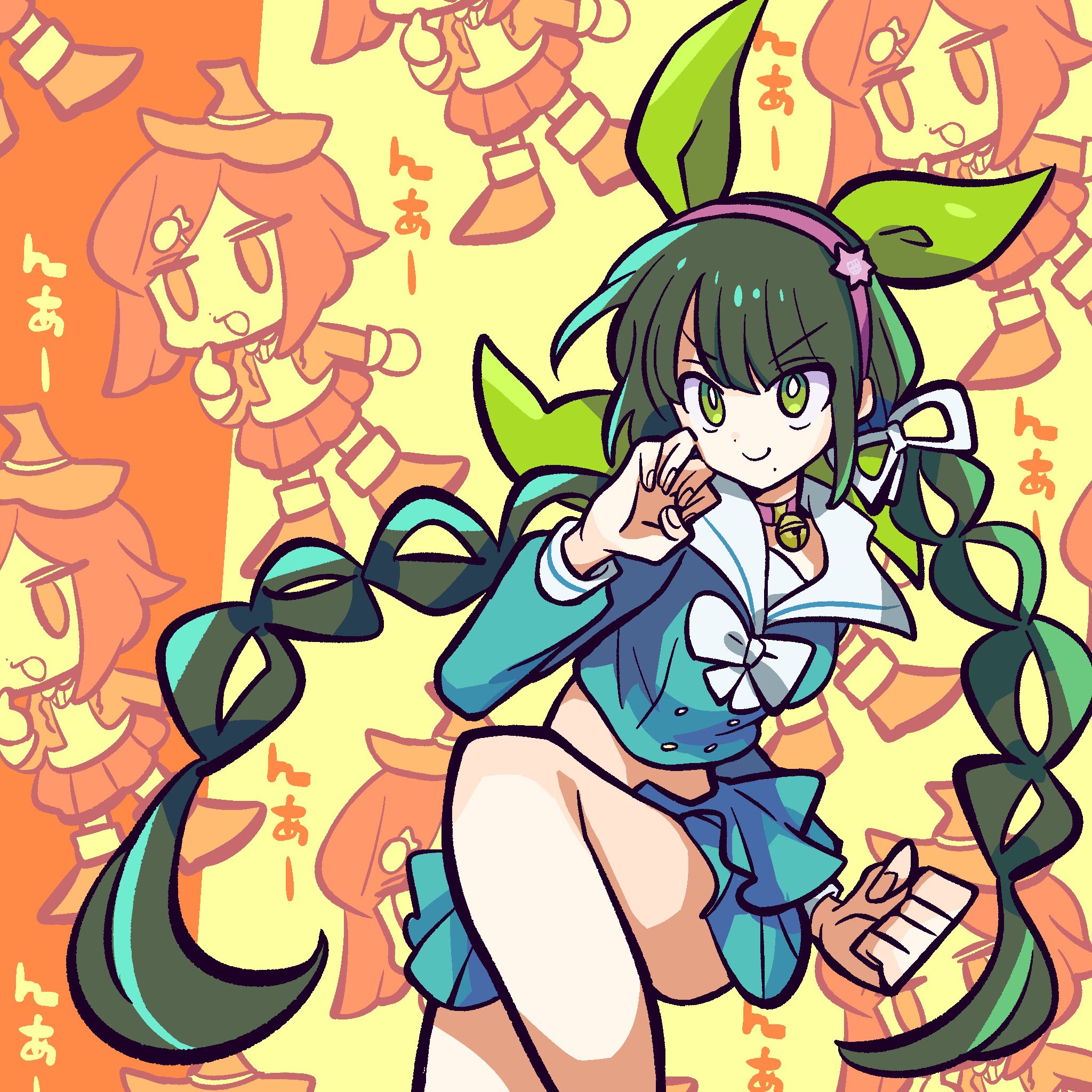 2girls bell black_hair bright_pupils chabashira_tenko chibi choker clenched_hands commentary_request danganronpa_(series) danganronpa_v3:_killing_harmony gem_hair_ornament green_eyes green_hair hair_ornament hair_ribbon hairband hat hichimochi_(4gdq1cyagsnyqqz) highres jacket knee_up layered_skirt leg_up long_hair long_sleeves mole mole_under_mouth multiple_girls neck_bell no_socks pink_choker pink_hairband pleated_skirt red_hair ribbon sailor_collar school_uniform shirt short_hair skirt smile solo_focus toon_(style) twintails very_long_hair white_pupils witch_hat yellow_background yumeno_himiko