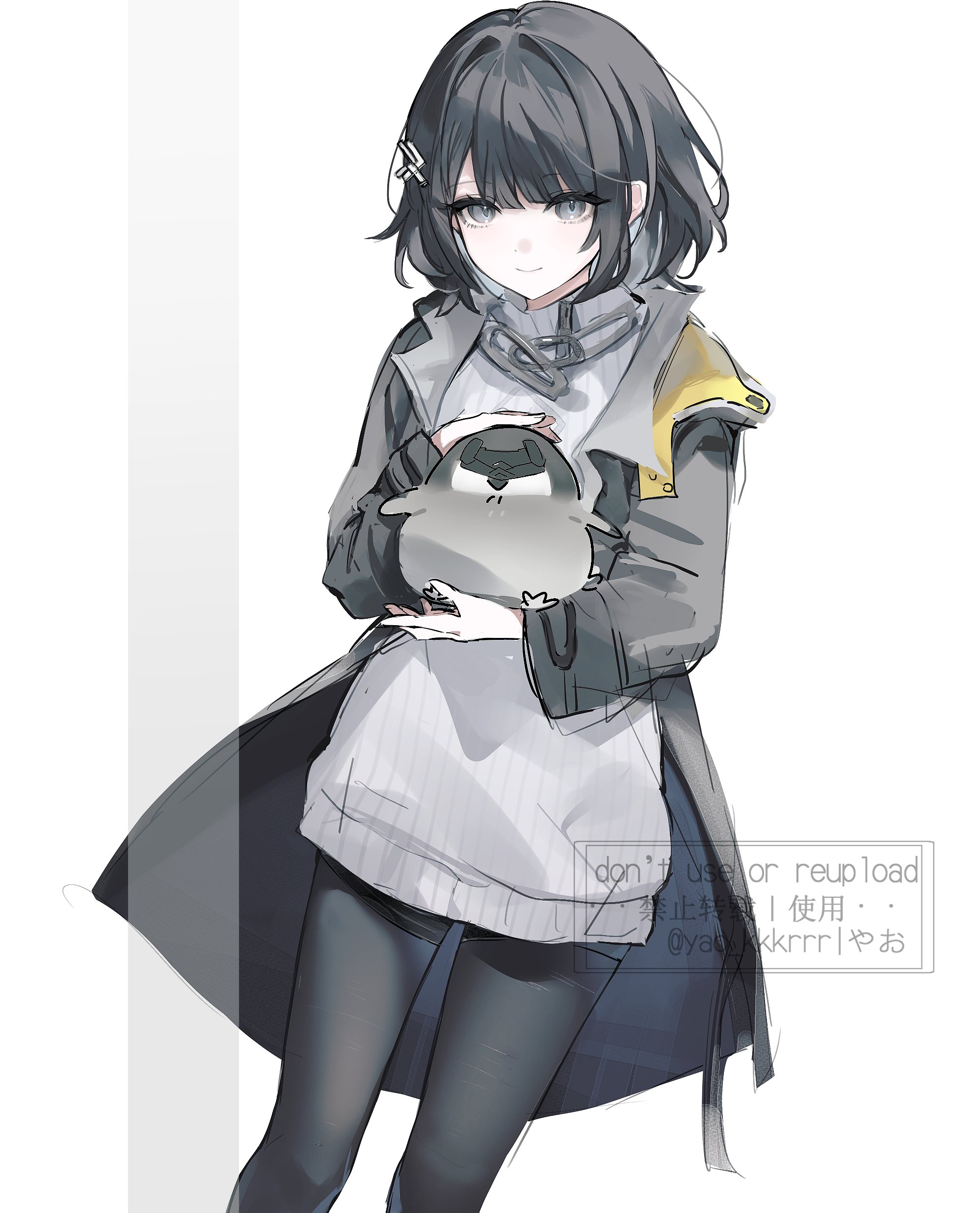 1girl absurdres animalization arknights arknights:_endfield bird black_coat black_hair black_pantyhose closed_mouth coat commentary_request cowboy_shot endministrator_(arknights) eye_mask female_endministrator_(arknights) grey_eyes highres hood hooded_coat light_smile long_sleeves looking_at_viewer mask medium_hair no_mask open_clothes pantyhose penguin person_and_animalization ribbed_sweater solo sweater twitter_username white_background white_sweater yao_krr