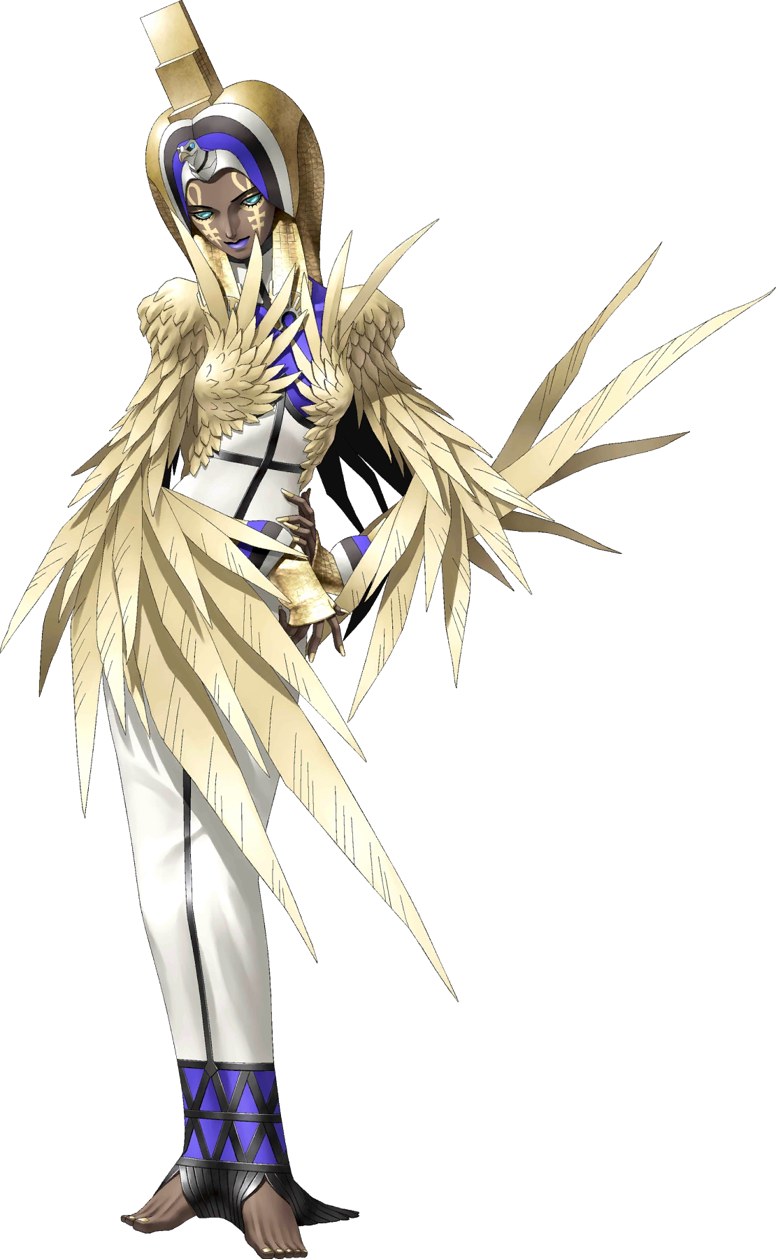 1girl aqua_eyes barefoot breasts dark-skinned_female dark_skin demon_(megami_tensei) fingernails full_body hand_on_own_hip highres isis_(megami_tensei) kazuma_kaneko long_fingernails looking_at_viewer medium_breasts nail_polish official_art shin_megami_tensei shin_megami_tensei_nine smile solo third-party_source transparent_background