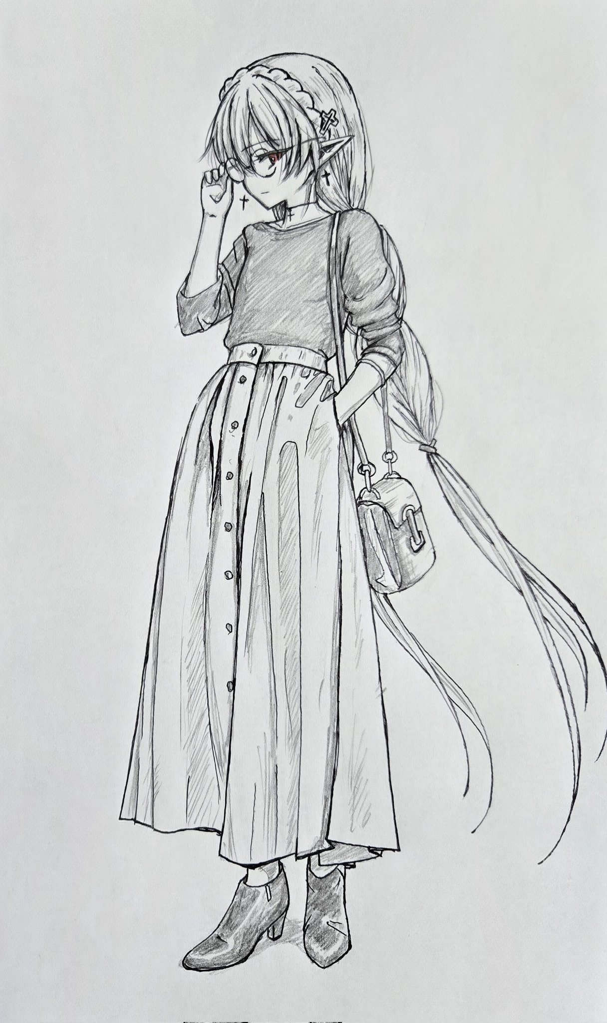 adjusting_eyewear alternate_costume ankle_boots arknights bag belt boots braid casual choker commentary_request cross cross_choker cross_earrings cross_hair_ornament earrings full_body graphite_(medium) greyscale hair_ornament hand_in_pocket handbag headband high_heel_boots high_heels highres jewelry long_skirt low_twin_braids monochrome pen_(medium) pointy_ears profile red_eyes round_eyewear shirt sidelocks skirt sleeves_pushed_up spot_color standing three-quarter_sleeves traditional_media twin_braids warfarin_(arknights) yumiya1129