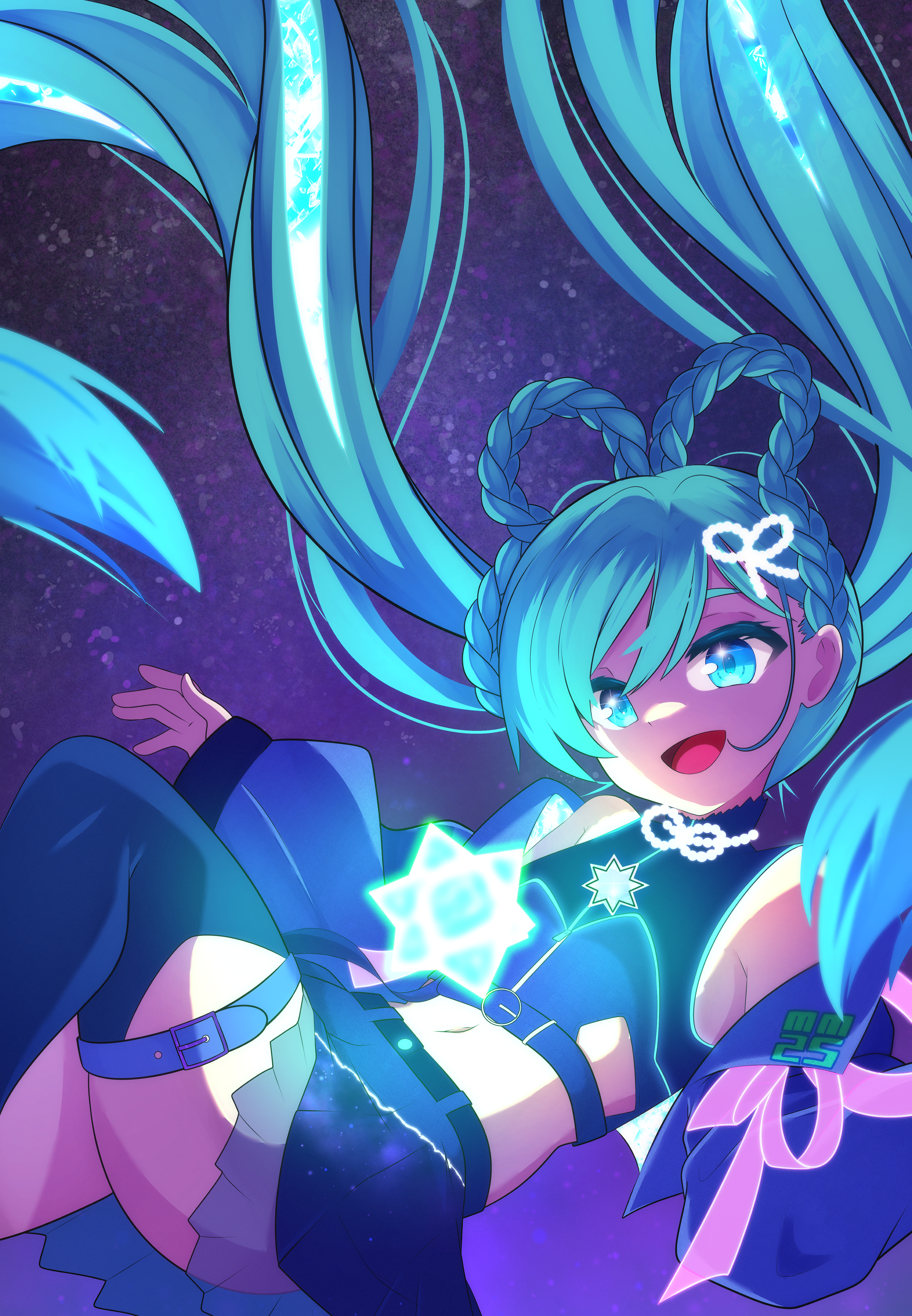 :d absurdly_long_hair absurdres aqua_eyes aqua_hair blue_jacket blue_thighhighs braid braided_hair_rings crop_top falling hair_ornament hair_rings hatsune_miku highres jacket long_hair lustrous_(vocaloid) magical_mirai_(vocaloid) magical_mirai_miku magical_mirai_miku_(2025) official_alternate_hairstyle open_mouth shion_(shion_aster) small_stellated_dodecahedron smile star_(symbol) star_hair_ornament thighhighs very_long_hair vocaloid