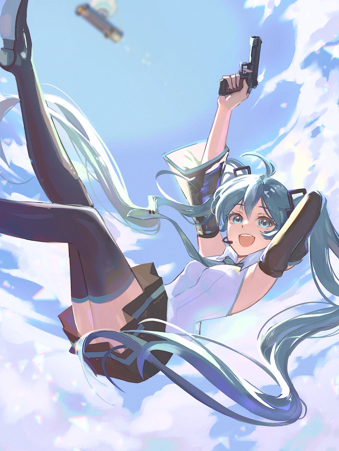 1girl ahoge aqua_eyes aqua_hair aqua_necktie aqua_trim arm_behind_head black_skirt black_sleeves black_thighhighs blue_sky breasts cloud cloudy_sky collared_shirt commentary detached_sleeves english_commentary falling fireraccoon foot_out_of_frame fortnite gun hair_between_eyes handgun hatsune_miku highres holding holding_gun holding_weapon long_hair looking_at_viewer medium_breasts necktie open_mouth pleated_skirt shirt skirt sky smile solo thighhighs twintails vocaloid weapon white_shirt