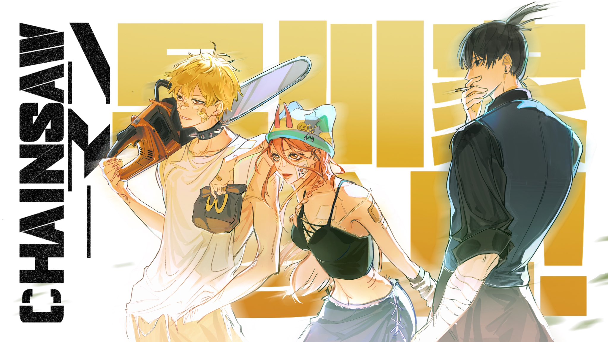 1girl 2boys arm_on_another's_shoulder arm_warmers bag bandaged_arm bandages bandaid bandaid_on_arm bandaid_on_face bandaid_on_nose beanie black_hair black_shirt blonde_hair braid chainsaw chainsaw_man cigarette collar copyright_name cowboy_shot denji_(chainsaw_man) hand_in_pocket hat hayakawa_aki highres holding holding_bag holding_chainsaw holding_cigarette horns long_hair looking_ahead multiple_boys paper_bag pink_hair ponytail power_(chainsaw_man) red_horns shirt short_hair short_ponytail smile smoke spiked_collar spikes starlynblue tank_top white_arm_warmers white_tank_top
