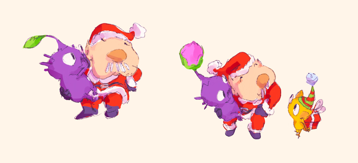1boy ^_^ belt belt_buckle large_nose black_belt black_boots black_eyes black_gloves boots buckle bud christmas closed_eyes closed_mouth collared_shirt colored_skin commentary creature english_commentary facial_hair fur-trimmed_headwear fur-trimmed_shirt fur_trim gift gloves green_hat hand_on_own_hip happy hat hat_bell holding holding_behind_back holding_creature holding_gift invisible_chair jason_lupas leaf long_sleeves looking_at_another multiple_views mustache nintendo no_mouth pants party_hat pikmin_(creature) pikmin_(series) pointy_ears pom_pom_(clothes) president_(pikmin) purple_hair purple_pikmin purple_skin red_hat red_pants red_shirt santa_costume santa_hat shirt short_hair simple_background sitting smile striped_clothes striped_headwear two-tone_hat very_short_hair yellow_background yellow_pikmin yellow_skin