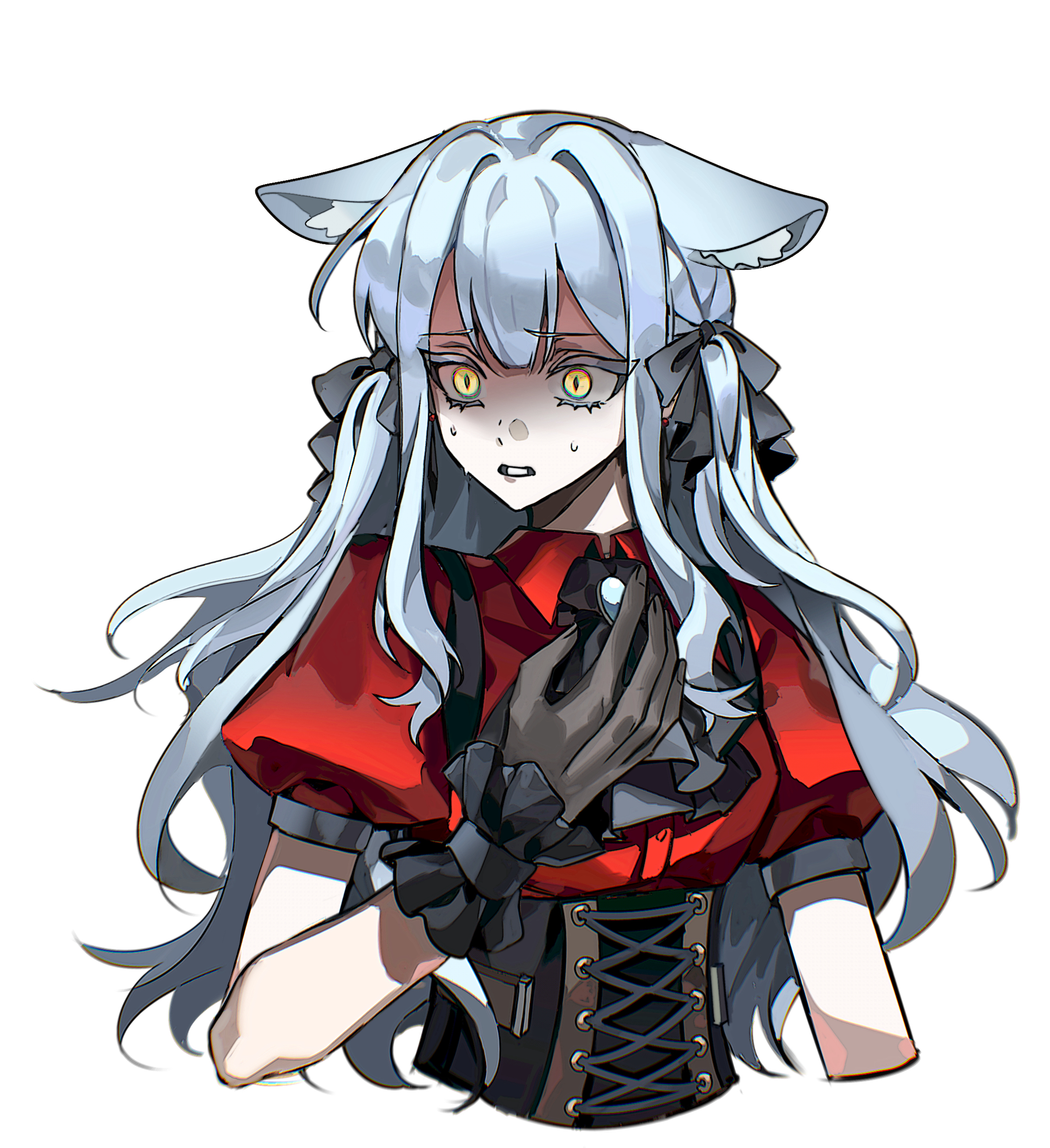 1girl animal_ear_fluff animal_ears ascot bang_dream! bang_dream!_it's_mygo!!!!! black_ascot black_corset black_gloves black_ribbon blue_hair chinese_commentary commentary_request corset dog_ears dog_girl gloves hair_ribbon highres kemonomimi_mode long_hair ne2op oblivionis_(bang_dream!) red_shirt ribbon shirt short_sleeves sidelocks simple_background slit_pupils solo sweatdrop togawa_sakiko two_side_up upper_body white_background wide-eyed
