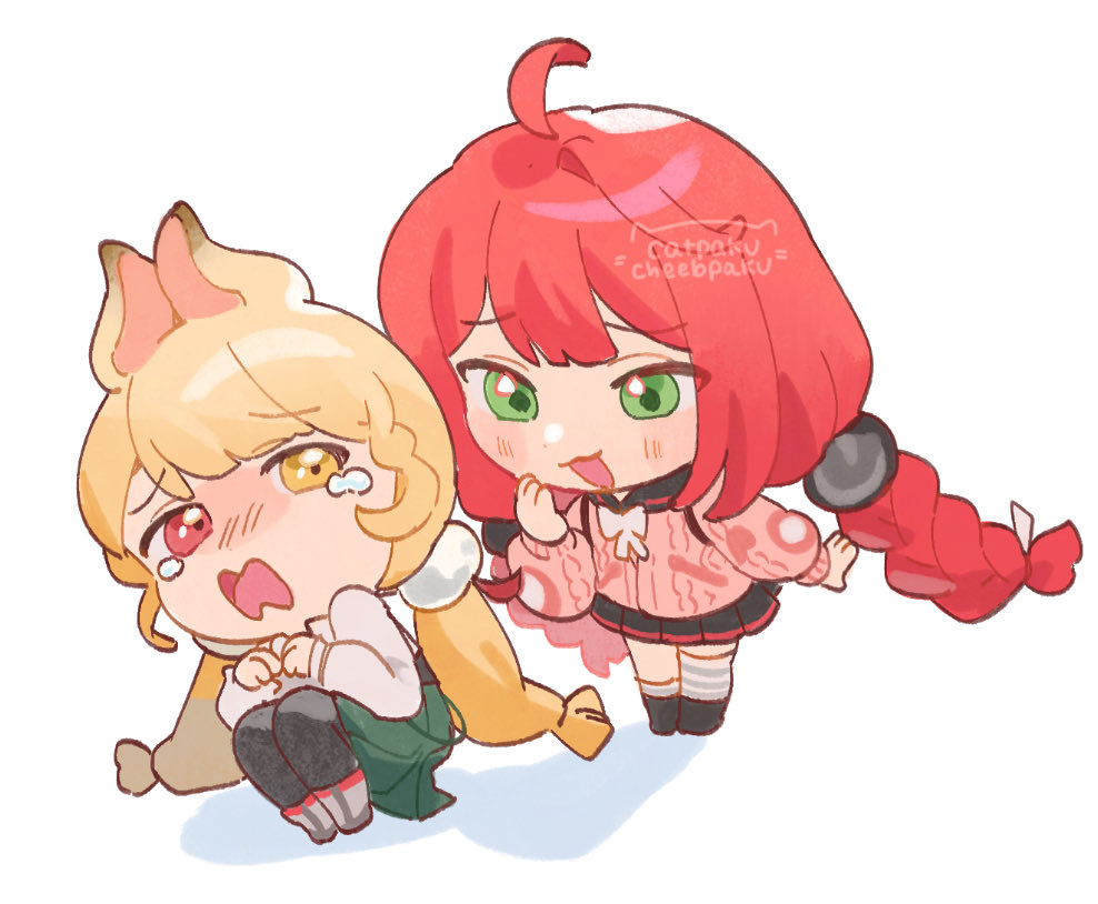 2girls alice_thymefield animal_ears artist_name asymmetrical_legwear black_pantyhose black_shoes blush braid braided_twintails cardigan chest_bow commentary english_commentary from_behind green_eyes green_skirt hair_ornament hand_on_own_face hearing_aid heterochromia long_hair looking_at_another multiple_girls open_mouth paku_(cheebpaku) pantyhose pink_cardigan rabbit_ears rabbit_girl red_eyes red_hair scared shadow shirt shoes simple_background skirt socks sphere_hair_ornament squatting striped_clothes striped_socks tears twintails ukinami_yuzuha uneven_legwear white_background white_shirt white_shoes yellow_eyes zenless_zone_zero