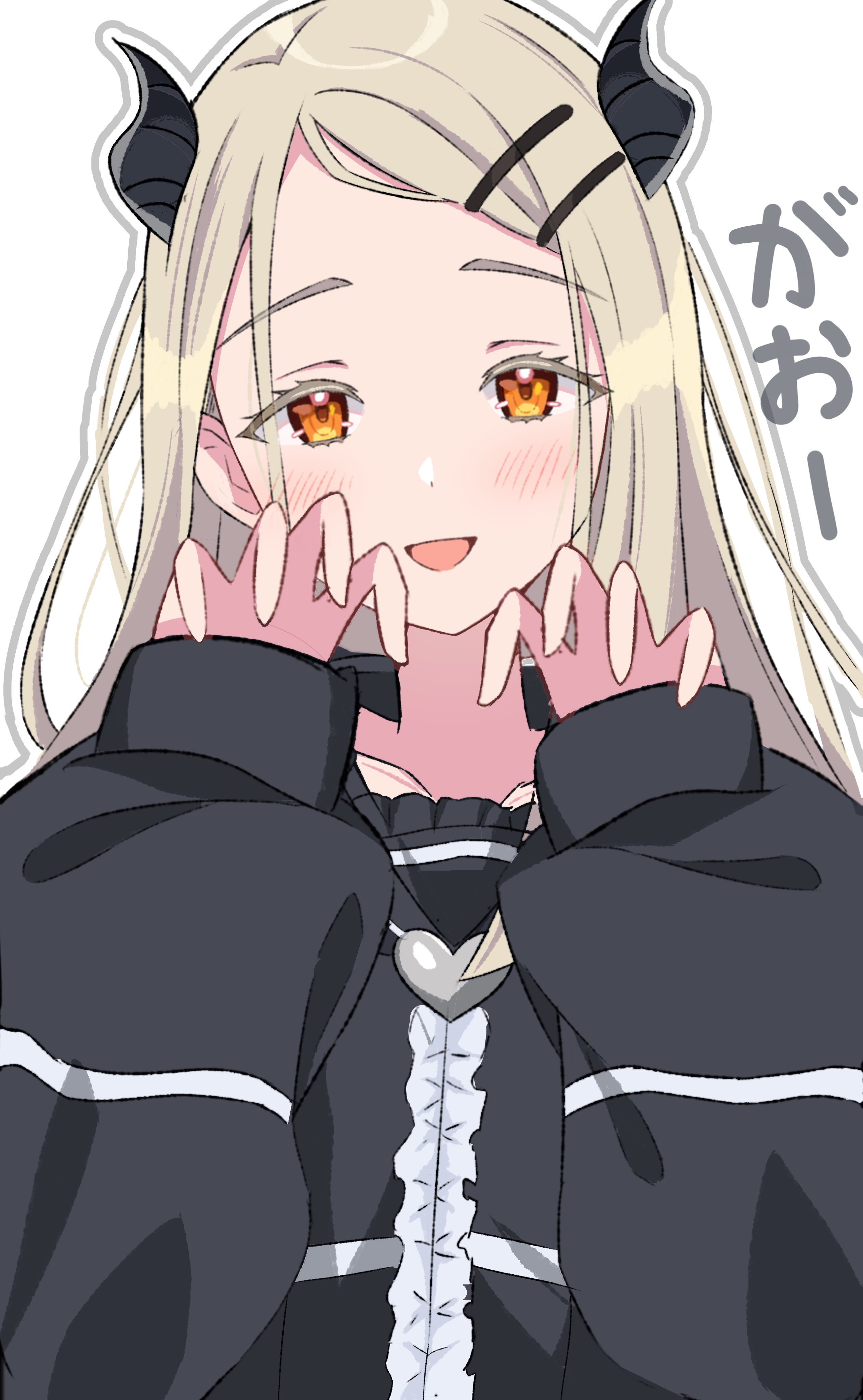 1girl absurdres black_horns black_shirt blonde_hair blush center_frills claw_pose colored_eyelashes frills gakuen_idolmaster hair_ornament hairclip hands_up hashtag-only_commentary heart heart_necklace highres horns idolmaster iroha_822 jewelry long_hair long_sleeves looking_at_viewer necklace open_mouth orange_eyes parallel_hairclips parted_bangs puffy_long_sleeves puffy_sleeves shinosawa_hiro shirt simple_background sleeves_past_wrists smile solo translation_request upper_body white_background