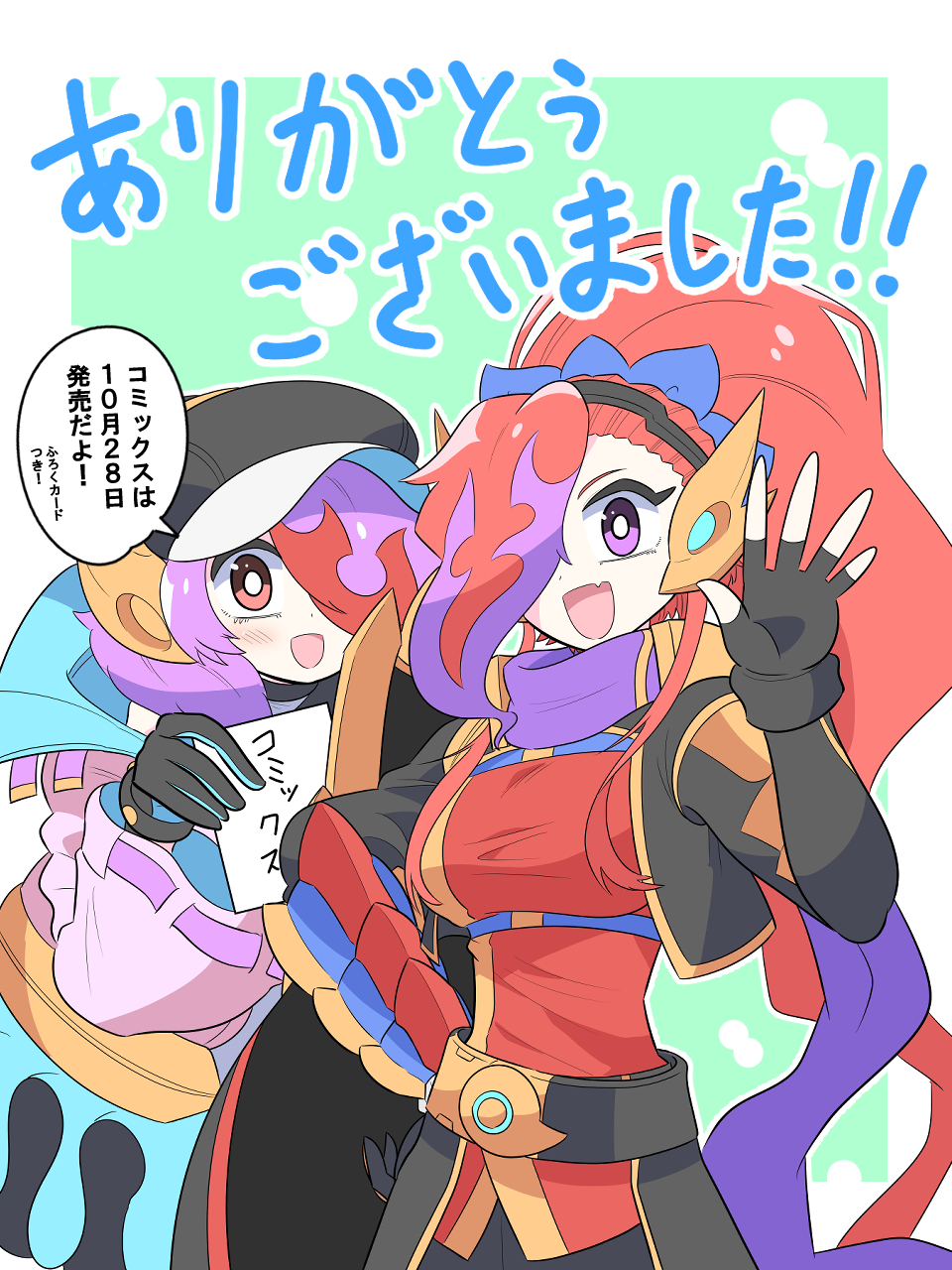 1boy 1girl black_gloves black_hat black_jacket brother_and_sister coat duel_masters duel_masters_gt ear_protection fang fingerless_gloves glenglassaugh_(duel_masters) glenturret_(duel_masters) gloves hair_over_one_eye hat high_ponytail highres holding holding_paper jacket kikuzuma_hiroki long_hair multicolored_hair official_art open_clothes open_jacket open_mouth paper pink_coat ponytail purple_eyes purple_hair purple_scarf red_eyes red_hair red_shirt scarf shirt siblings speech_bubble translation_request trap vambraces waving
