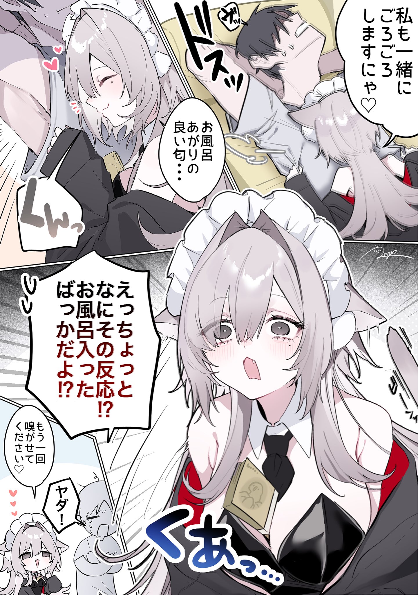 1boy 1girl animal_ears anoyo_(anoyode0) banknote cat_ears cat_girl cat_tail coat dialogue_box grey_eyes grey_hair highres long_hair maid_headdress money money_between_breasts off_shoulder open_mouth original playboy_bunny tail
