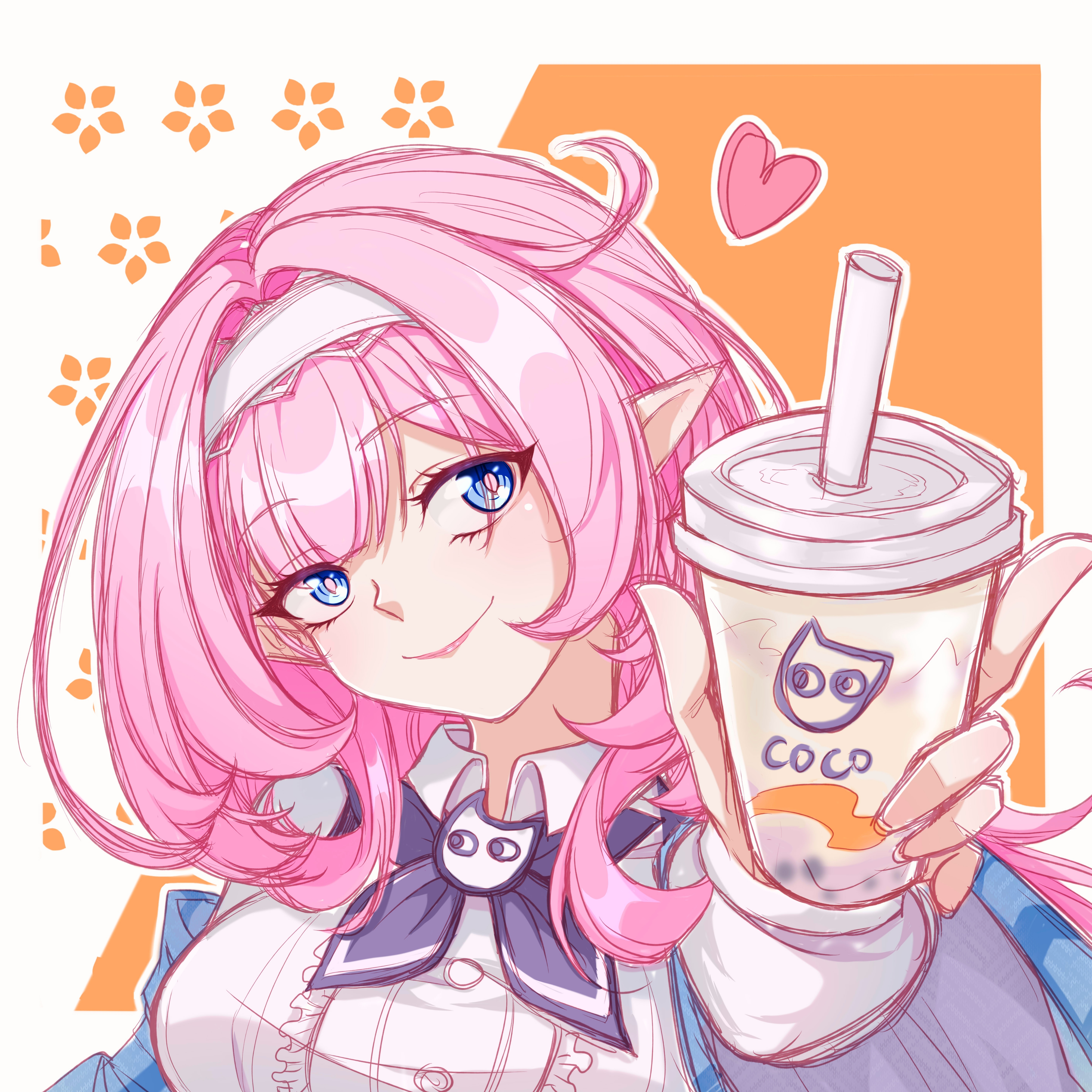 1girl absurdres blue_bow blue_bowtie blue_eyes bow bowtie breasts bubble_tea ccii00 chinese_commentary commentary_request cup disposable_cup dress elf elysia_(coco)_(honkai_impact) elysia_(honkai_impact) hairband heart highres holding holding_cup honkai_(series) honkai_impact_3rd large_breasts official_alternate_costume orange_background pink_hair pointy_ears smile solo upper_body white_dress