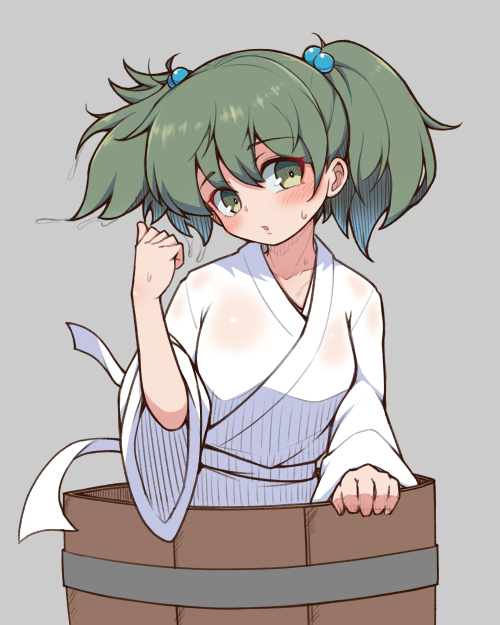 1girl blush breasts bucket collarbone commentary_request green_eyes green_hair grey_background hair_bobbles hair_ornament highres in_bucket in_container kisume looking_to_the_side robe shiro_bouzu short_hair simple_background small_breasts solo touhou twintails white_robe wooden_bucket
