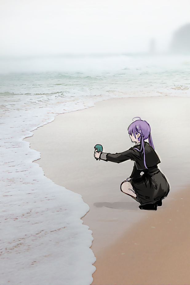 1girl ahoge beach black_jacket black_skirt character_doll chibigurumi commentary_request doll gakuen_idolmaster gokugetsu_gakuen_school_uniform holding holding_doll idolmaster inamori_ryusa jacket kaya_rinha long_sleeves outdoors purple_hair school_uniform skirt solo squatting tsukimura_temari twintails
