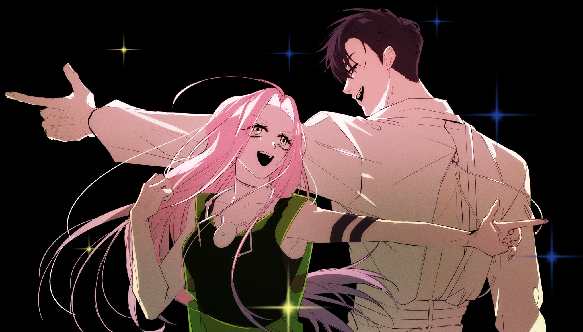 1boy 1girl alien_stage armband back_cutout black_background black_eyes black_hair black_tank_top choker clothing_cutout cosplay green_tank_top grey_choker highres ivan_(alien_stage) jewelry layered_clothes long_hair long_sleeves luka_(alien_stage) luka_(alien_stage)_(cosplay) mizi_(alien_stage) multicolored_hair necklace open_mouth outstretched_arm pater pink_hair pointing purple_hair red_pupils see-through_tank_top shirt short_hair smile tank_top till_(alien_stage) till_(alien_stage)_(cosplay) two-tone_hair very_long_hair very_short_hair white_shirt yellow_eyes