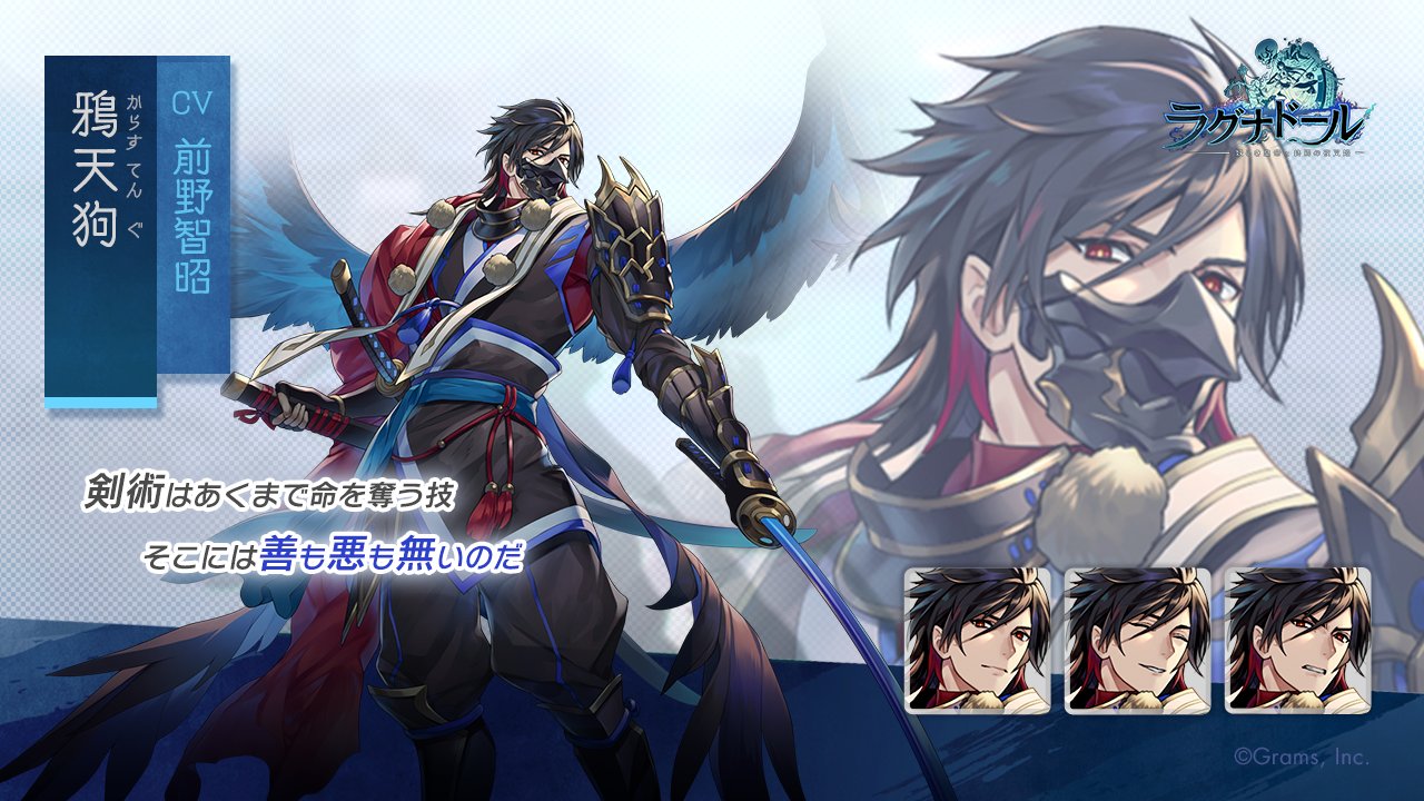 1boy black_hair black_mask character_name commentary_request company_name copyright_logo copyright_name hair_between_eyes holding holding_sword holding_weapon karasu_tengu_(ragnador) katana logo looking_at_viewer male_focus multicolored_hair multiple_expressions official_art ragnador red_eyes red_hair second-party_source streaked_hair sword two-tone_hair weapon wings