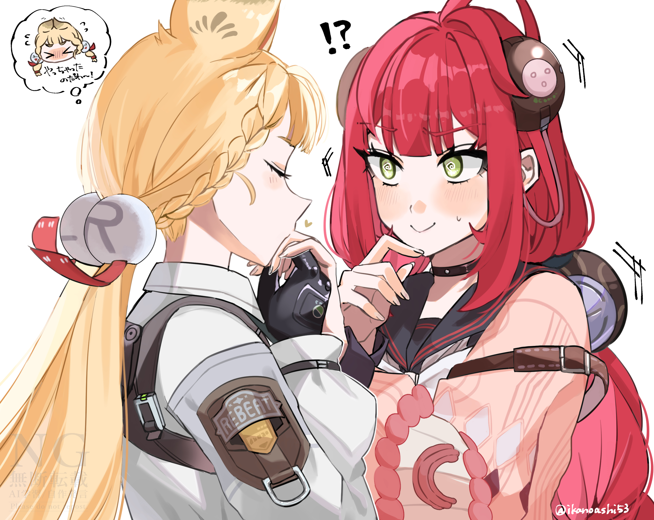 1girl alice_thymefield animal_ears blonde_hair braid braided_twintails breasts hair_ornament hearing_aid heterochromia highres ikanoashi53 long_hair looking_at_viewer low_twintails multiple_girls rabbit_ears rabbit_girl red_eyes shirt simple_background sphere_hair_ornament twintails ukinami_yuzuha white_shirt yellow_eyes zenless_zone_zero