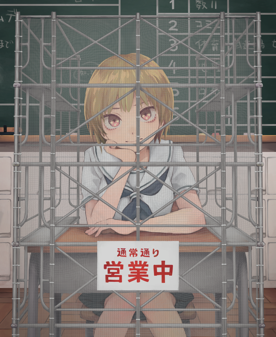 1girl brown_eyes brown_hair chair chalkboard closed_mouth commentary_request desk indoors looking_at_viewer original school_uniform serafuku short_hair sitting skirt solo translated yajirushi_(chanoma)