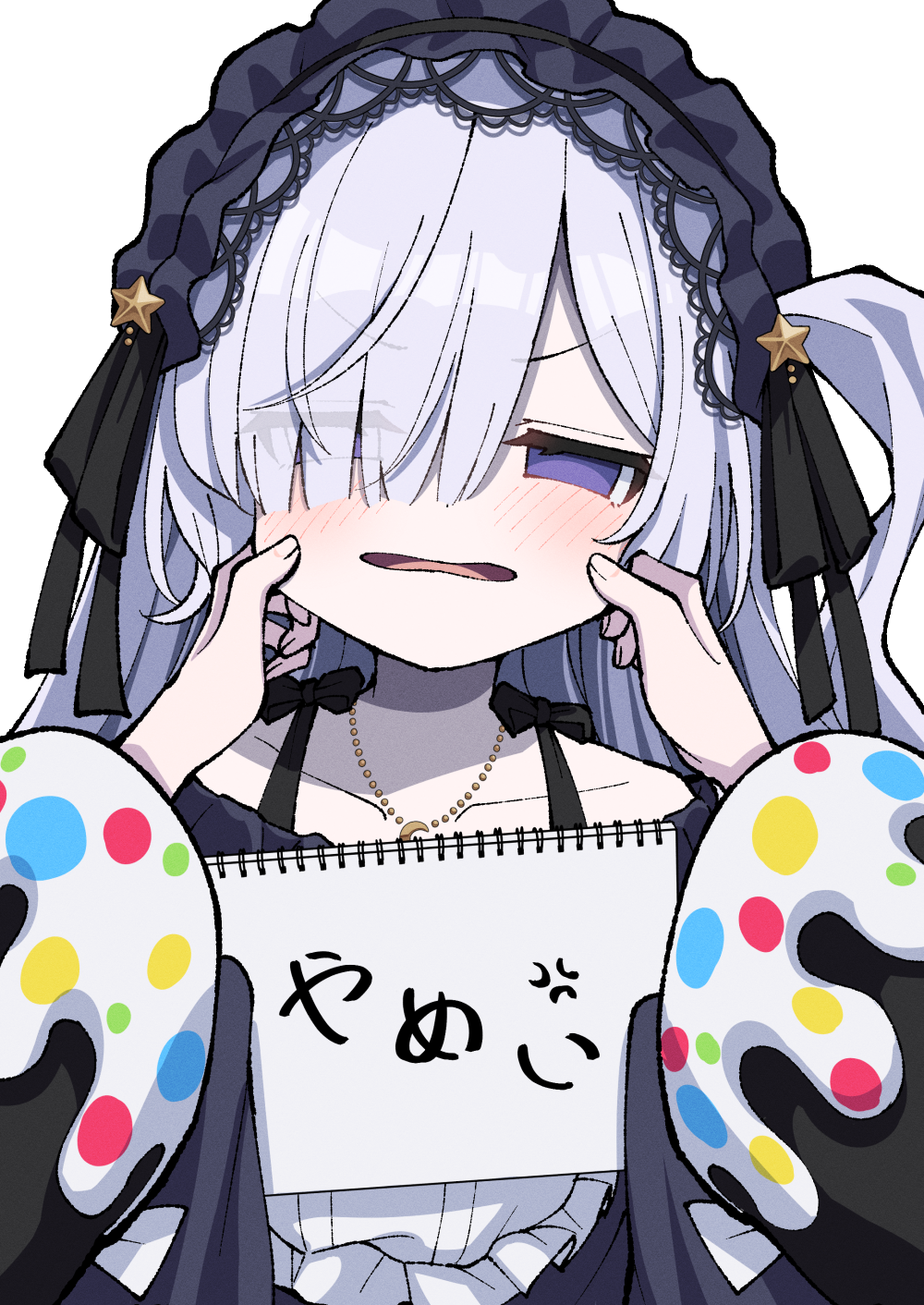 2girls cheek_pinching crescent crescent_necklace dress empty_eyes gothic_lolita hairband highres holding holding_sketchbook jewelry jogasaki_noah lolita_fashion lolita_hairband long_hair looking_at_viewer magical_girl mahou_shoujo_no_majo_saiban multiple_girls natsume_an-an necklace pinching pov purple_dress purple_eyes purple_hairband simple_background sketchbook sleeves_past_fingers sleeves_past_wrists solo_focus tied_sleeves tsukimirin very_long_hair white_background white_hair