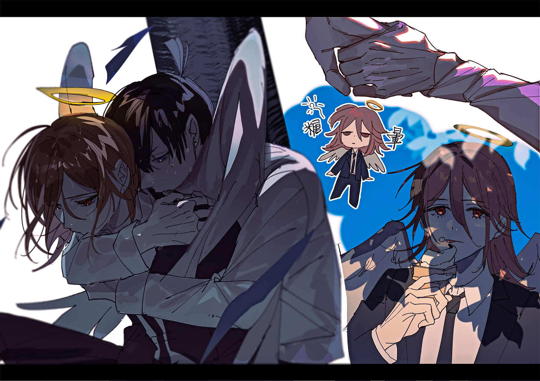 2boys angel angel_devil_(chainsaw_man) angel_wings black_jacket black_necktie black_suit business_suit chainsaw_man feathered_wings formal_clothes glowing glowing_halo halo hayakawa_aki highres hug jacket male_focus multiple_boys necktie shirt_tucked_in suit suit_jacket traditional_halo white_wings wings yurichen111
