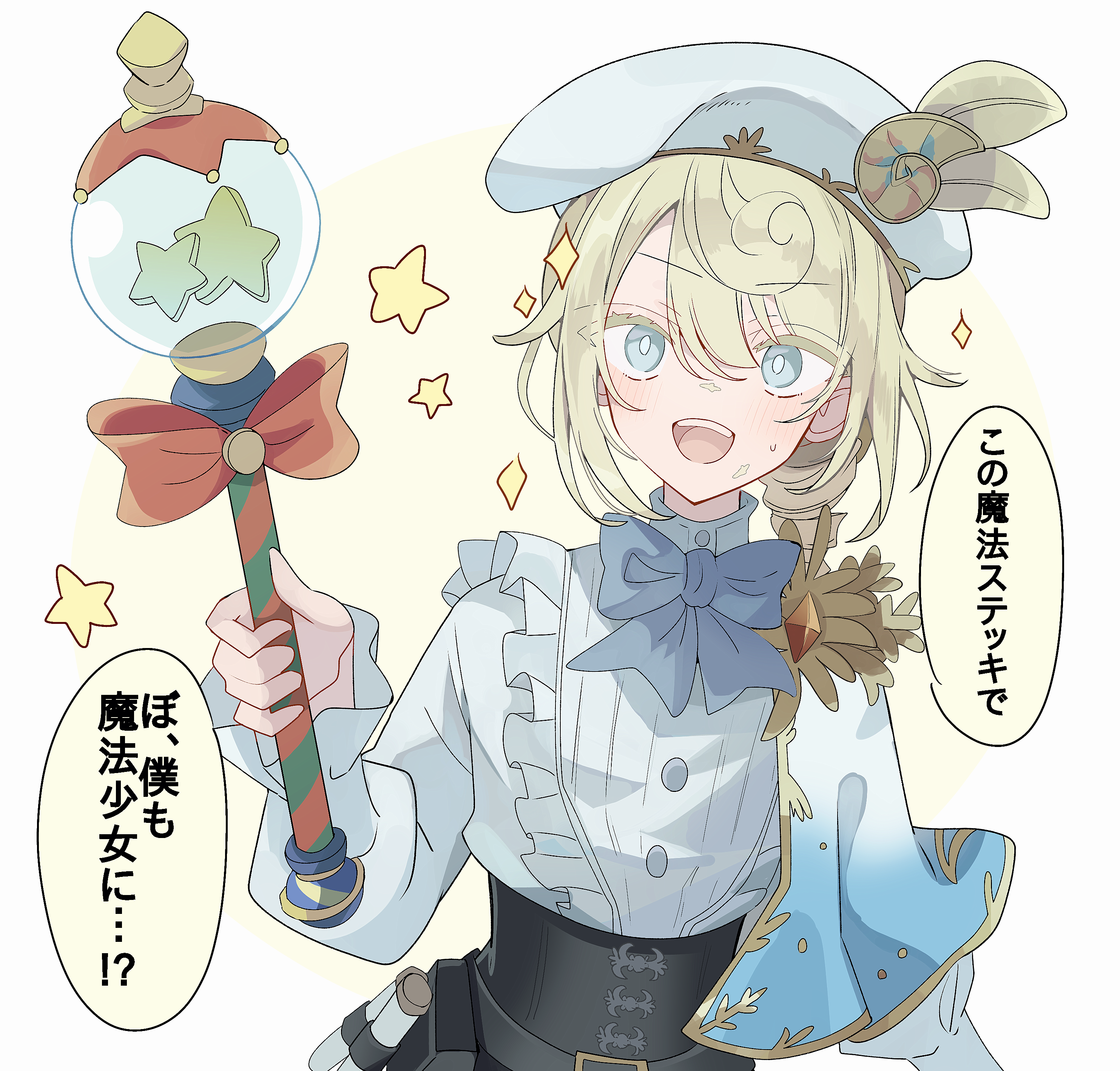 :d absurdres androgynous beret black_corset blonde_hair blue_bow blue_eyes blush bow capelet colored_eyelashes corset drill_hair drill_ponytail edgar_valden edgar_valden_(golden_ratio) frilled_shirt frilled_sleeves frills gold_trim hat high_collar highres holding holding_wand identity_v looking_at_viewer male_focus official_alternate_costume open_mouth potechi_(kaoriion613) puffy_sleeves shirt smile sparkle translation_request trap wand white_capelet white_hat