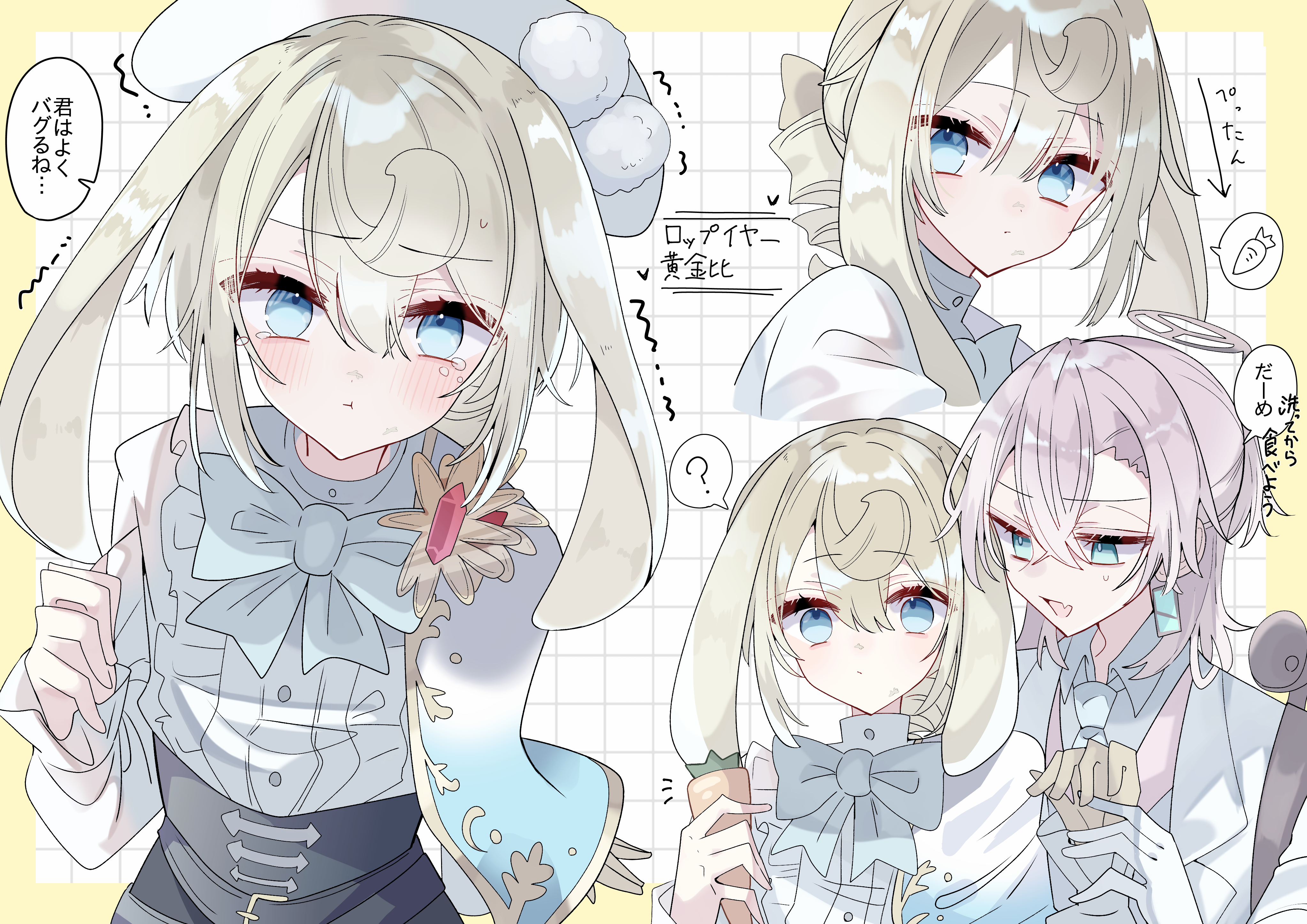 2boys :d :t absurdres animal_ears beret black_corset blonde_hair blue_bow bow capelet corset crossed_bangs drill_hair drill_ponytail edgar_valden edgar_valden_(golden_ratio) fang gem gloves hair_between_eyes half_updo hat highres identity_v jacket looking_at_another looking_at_viewer lop_rabbit_ears luca_balsa luca_balsa_(paranormal_detective) male_focus multiple_boys necktie official_alternate_costume open_mouth ponytail potechi_(kaoriion613) pout rabbit_boy rabbit_ears raised_eyebrows red_gem shirt short_ponytail skin_fang smile striped_blush sweat tearing_up trembling white_capelet white_gloves white_jacket white_necktie white_shirt