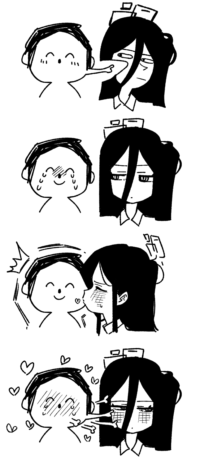 1boy 1girl :| ^^^ ^_^ aris_(blue_archive) asahina_yoshitoshi blue_archive blush closed_eyes closed_mouth cropped_head crying doodle_sensei_(blue_archive) halo heart high_contrast highres kiss long_hair maomao_evading_jinshi's_kiss_(meme) meme monochrome puckered_lips rectangular_halo sensei_(blue_archive) simple_background smile white_background wing_collar
