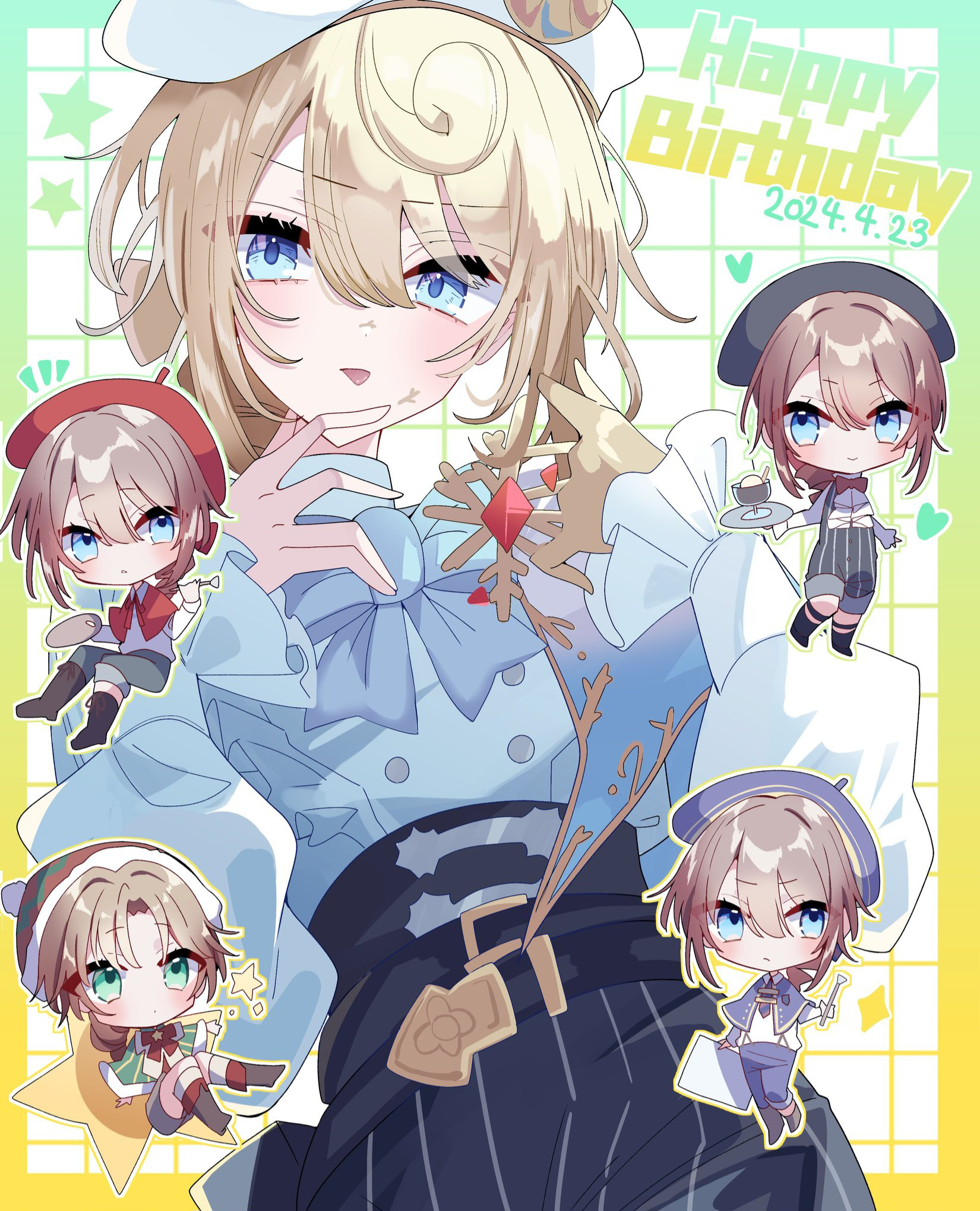 1boy :p androgynous beret black_corset black_shorts blonde_hair blue_bow blue_capelet blue_eyes blue_pants bow bowtie capelet chibi corset dated edgar_valden edgar_valden_(cozy_christmas_eve) edgar_valden_(golden_ratio) edgar_valden_(turpentine) frilled_shirt frilled_sleeves frills furrowed_brow green_capelet green_eyes hair_between_eyes happy_birthday hat highres holding holding_paintbrush identity_v legwear_garter looking_at_viewer male_focus official_alternate_costume paintbrush pants potechi_(kaoriion613) puffy_sleeves red_bow red_bowtie red_capelet shirt shorts striped_clothes striped_shorts suspenders tongue tongue_out trap white_shirt
