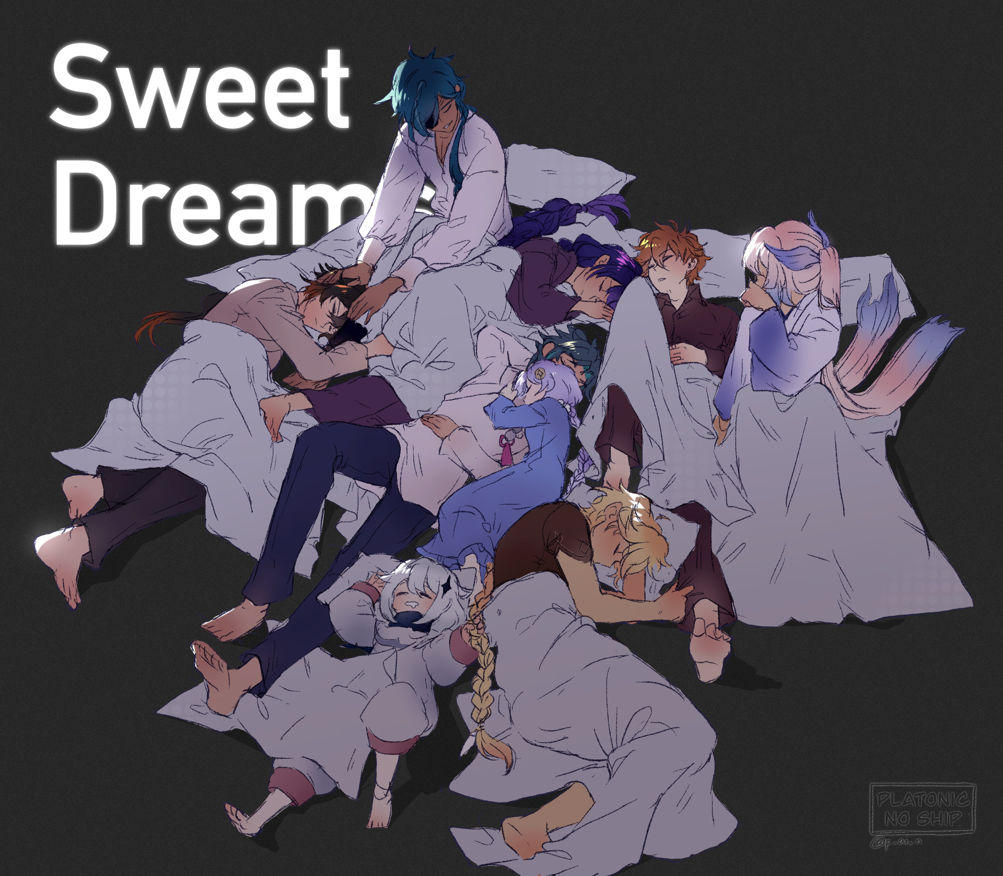 4girls 5boys aether_(genshin_impact) alternate_costume artist_name barefoot blanket blonde_hair blue_hair blunt_bangs braid brown_hair child clenched_teeth closed_eyes closed_mouth collared_shirt commentary curly_hair dark-skinned_male dark_skin drooling english_commentary english_text eyepatch f-ai-n feet genshin_impact gradient_hair green_hair grey_background hair_between_eyes hair_ornament hand_on_another's_head head_tilt highres hug kaeya_(genshin_impact) leaning_on_person long_braid long_hair long_sleeves looking_down looking_to_the_side lying mask mask_on_head mouth_drool multicolored_hair multiple_boys multiple_girls on_back on_side orange_hair paimon_(genshin_impact) pajamas pants parted_bangs parted_lips pectoral_cleavage pectorals pink_hair purple_hair qiqi_(genshin_impact) raiden_shogun red_mask sangonomiya_kokomi shirt short_hair short_sleeves single_braid sitting sleeping smile star_(symbol) star_hair_ornament streaked_hair tartaglia_(genshin_impact) teeth watermark white_hair xiao_(genshin_impact) zhongli_(genshin_impact)