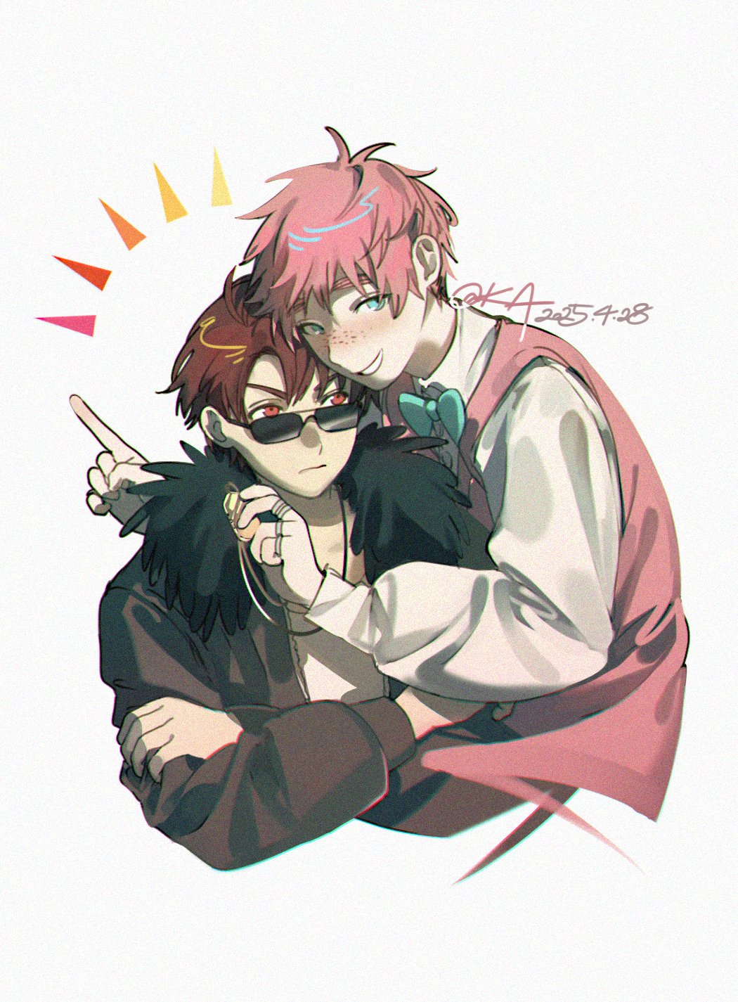 2boys ahoge america_(hetalia) antenna_hair artist_name axis_powers_hetalia black-framed_eyewear blue_bow blue_bowtie blue_eyes blush bow bowtie brown_hair brown_jacket buttons closed_mouth collared_shirt crossed_arms disappearoften freckles fur-trimmed_jacket fur_trim gold_ring hair_between_eyes hands_up highres holding holding_jewelry index_finger_raised jacket jewelry long_sleeves looking_at_another looking_at_viewer male_focus multiple_boys multiple_rings necklace open_clothes open_jacket pink_hair pink_vest puffy_long_sleeves puffy_sleeves red_eyes ring shirt short_hair simple_background smile sunglasses t-shirt teeth united_kingdom_(hetalia) upper_body v-shaped_eyebrows vest white_background white_shirt