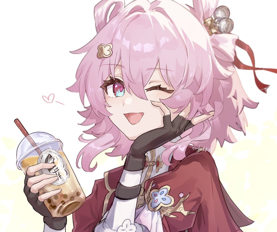 1girl ;d artist_name black_gloves commentary drink drinking_straw fingerless_gloves gloves hair_between_eyes heart holding holding_drink looking_at_viewer one_eye_closed open_mouth pink_hair smile solo spoken_heart suwa_(swk_kkk) untranslatable_commentary