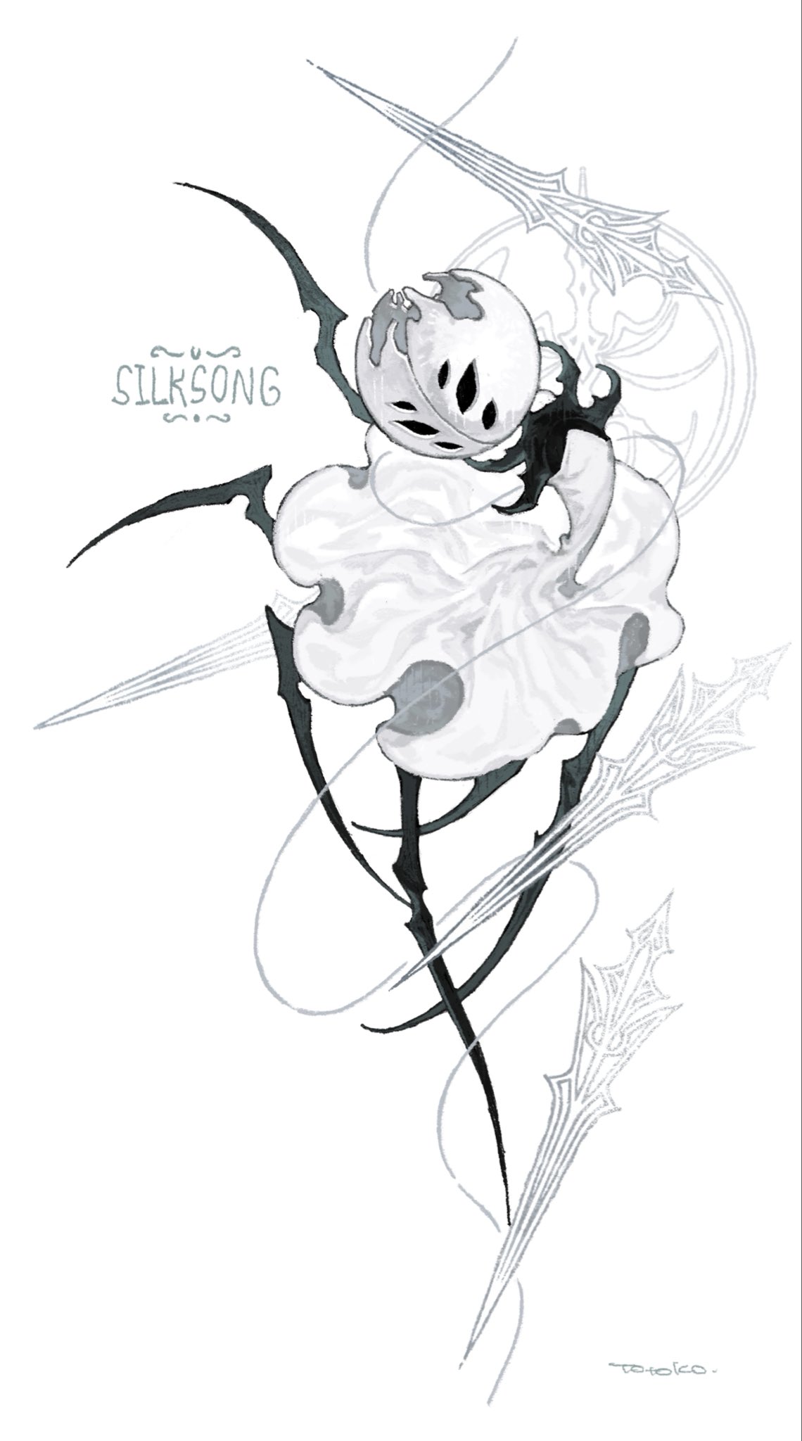 1girl arthropod_girl black_eyes black_skin chinese_commentary colored_skin commentary_request copyright_name dress extra_eyes first_sinner_(hollow_knight) full_body highres hollow_eyes hollow_knight hollow_knight:_silksong la_bo_chu_shi solo white_background white_dress