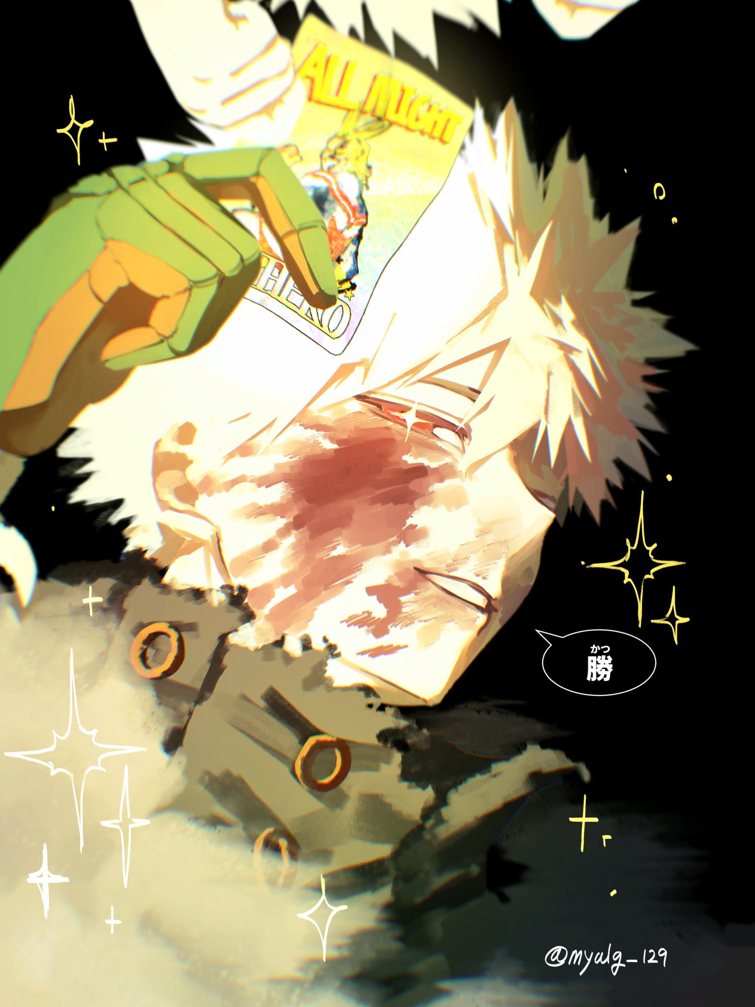 1boy all_might arm_up bakugou_katsuki black_shirt blonde_hair blood blood_on_face boku_no_hero_academia card commentary gloves hashtag-only_commentary highres holding holding_card injury male_focus multicolored_gloves myalg_129 parted_bangs shirt short_hair smile solo solo_focus speech_bubble spiked_hair teeth torn_clothes twitter_username