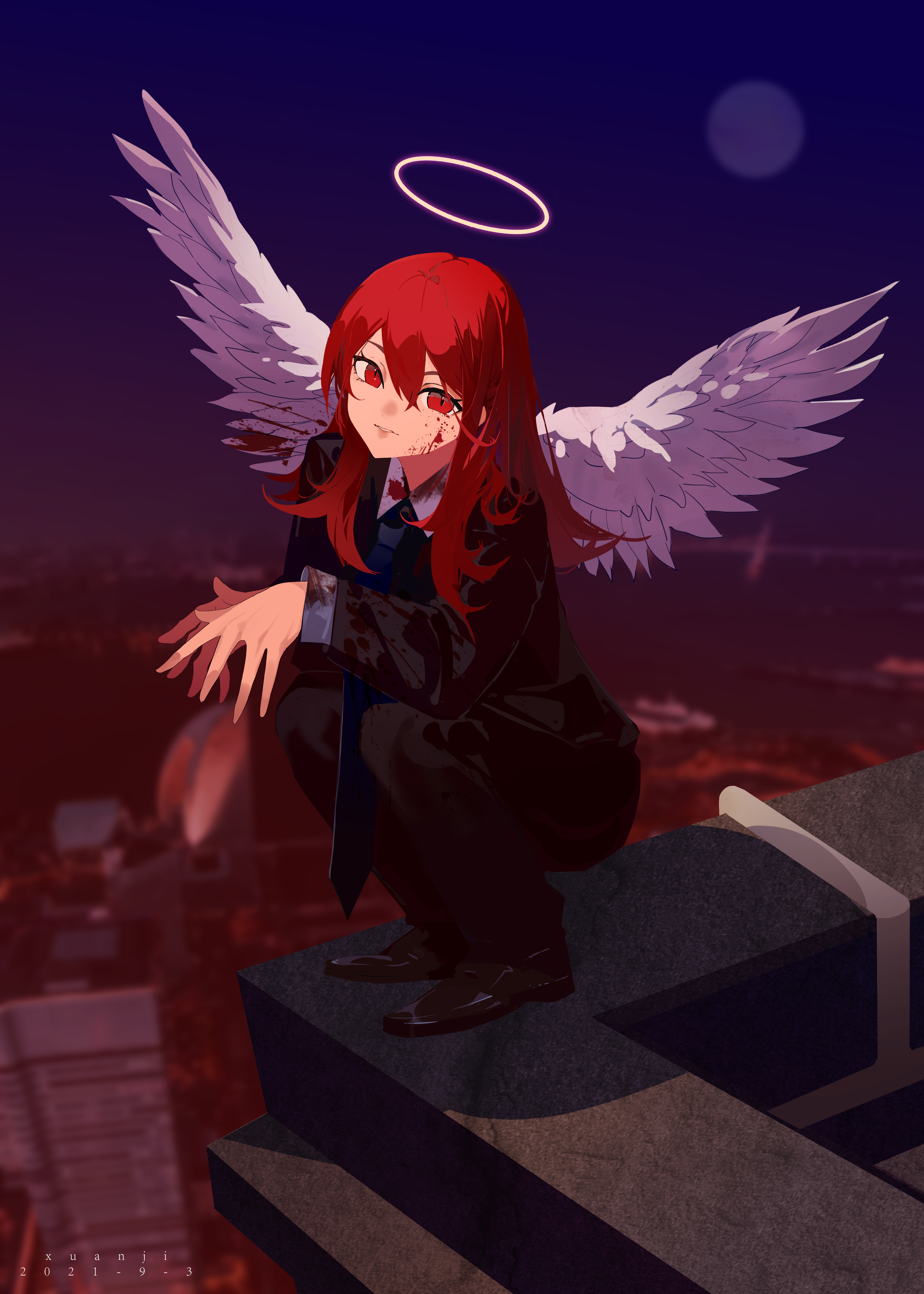 1boy absurdres angel_devil_(chainsaw_man) angel_wings black_jacket black_pants black_suit blood blood_on_face chainsaw_man city closed_mouth formal_clothes halo highres jacket long_hair looking_at_viewer male_focus outdoors pant_suit pants red_eyes red_hair solo squatting suit suit_jacket trap wings xuanji yellow_halo