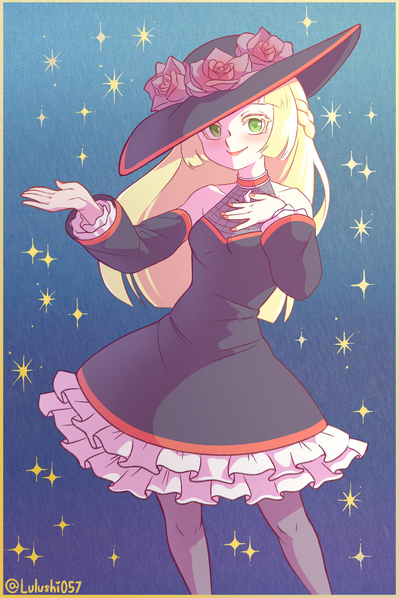 1girl alternate_costume black_dress black_hat blonde_hair blue_background dress frilled_dress frills gradient_background green_eyes hand_on_own_chest hat highres lillie_(pokemon) lulushi057 nintendo pokemon pokemon_sun_and_moon red_lips red_nails solo twitter_username