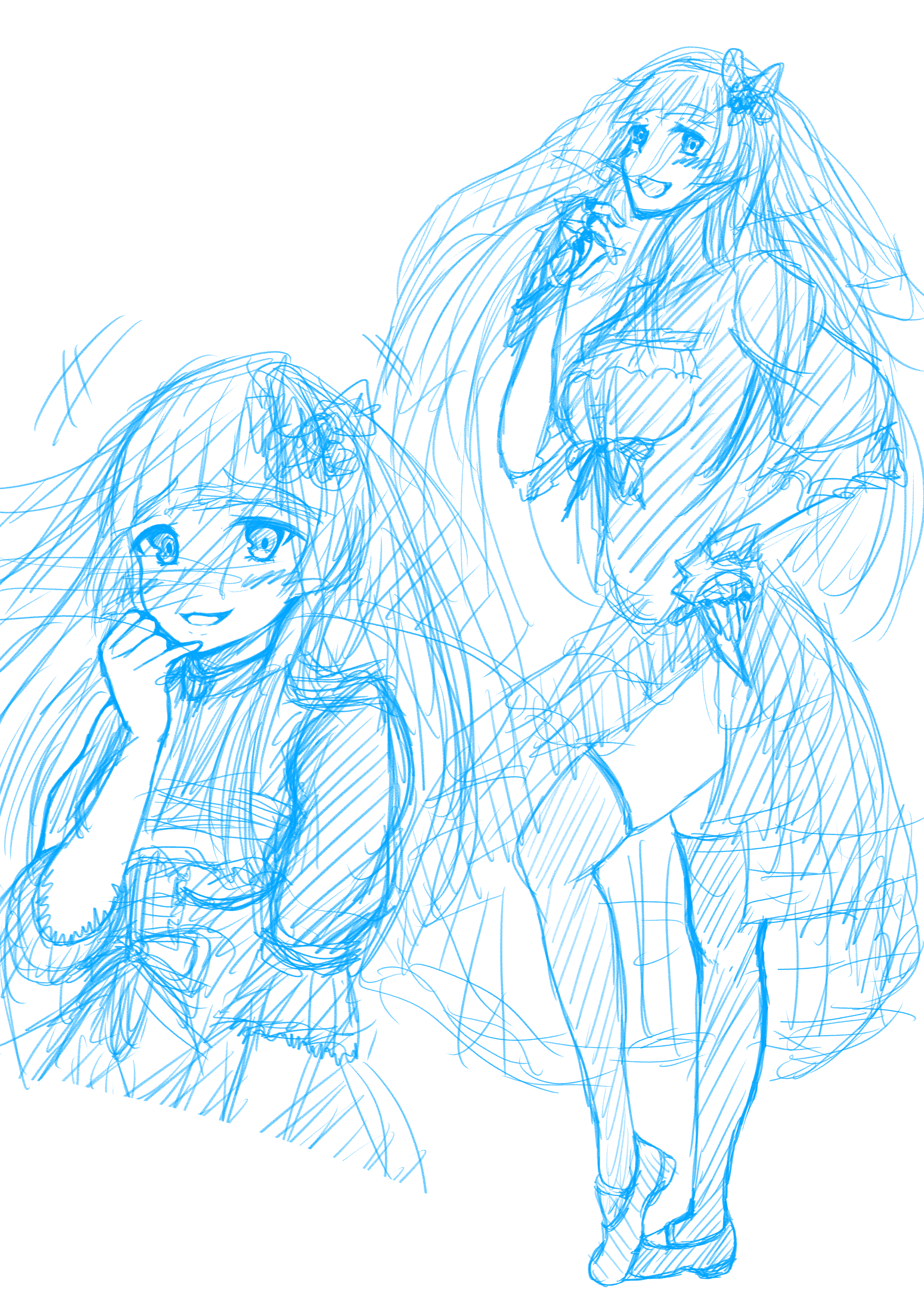 1girl absurdres bad_id bad_pixiv_id begiramagonn breasts chaos_juliet_(grimms_notes) full_body grimms_notes highres laughing long_hair monochrome multiple_views sketch solo unfinished