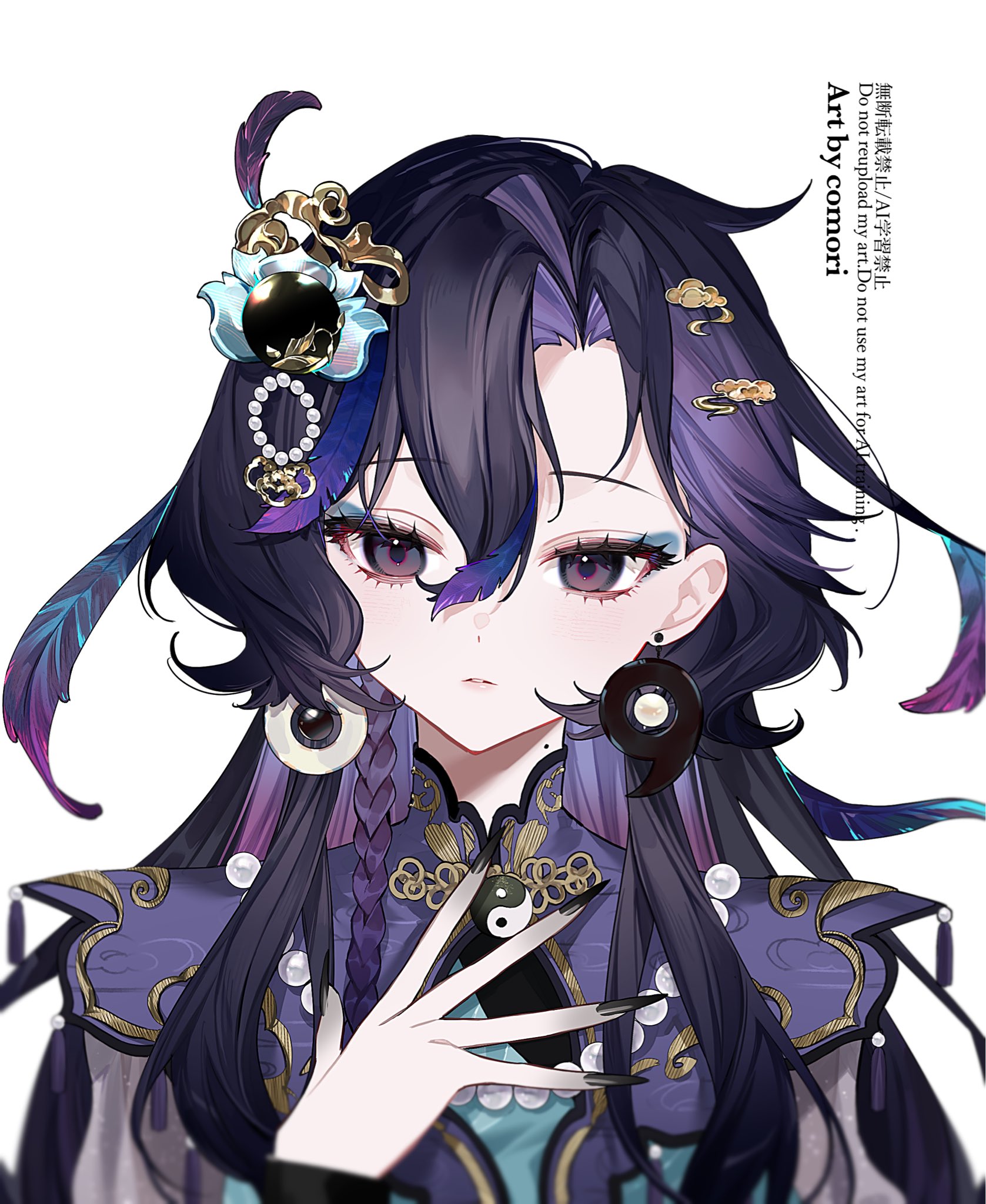 1girl artist_name black_eyes black_nails commentary commission comori fingernails hair_between_eyes hand_on_own_chest highres long_fingernails long_hair long_sleeves mole mole_on_neck nail_polish original parted_bangs parted_lips portrait purple_hair purple_shirt shirt simple_background solo untranslatable_commentary watermark white_background