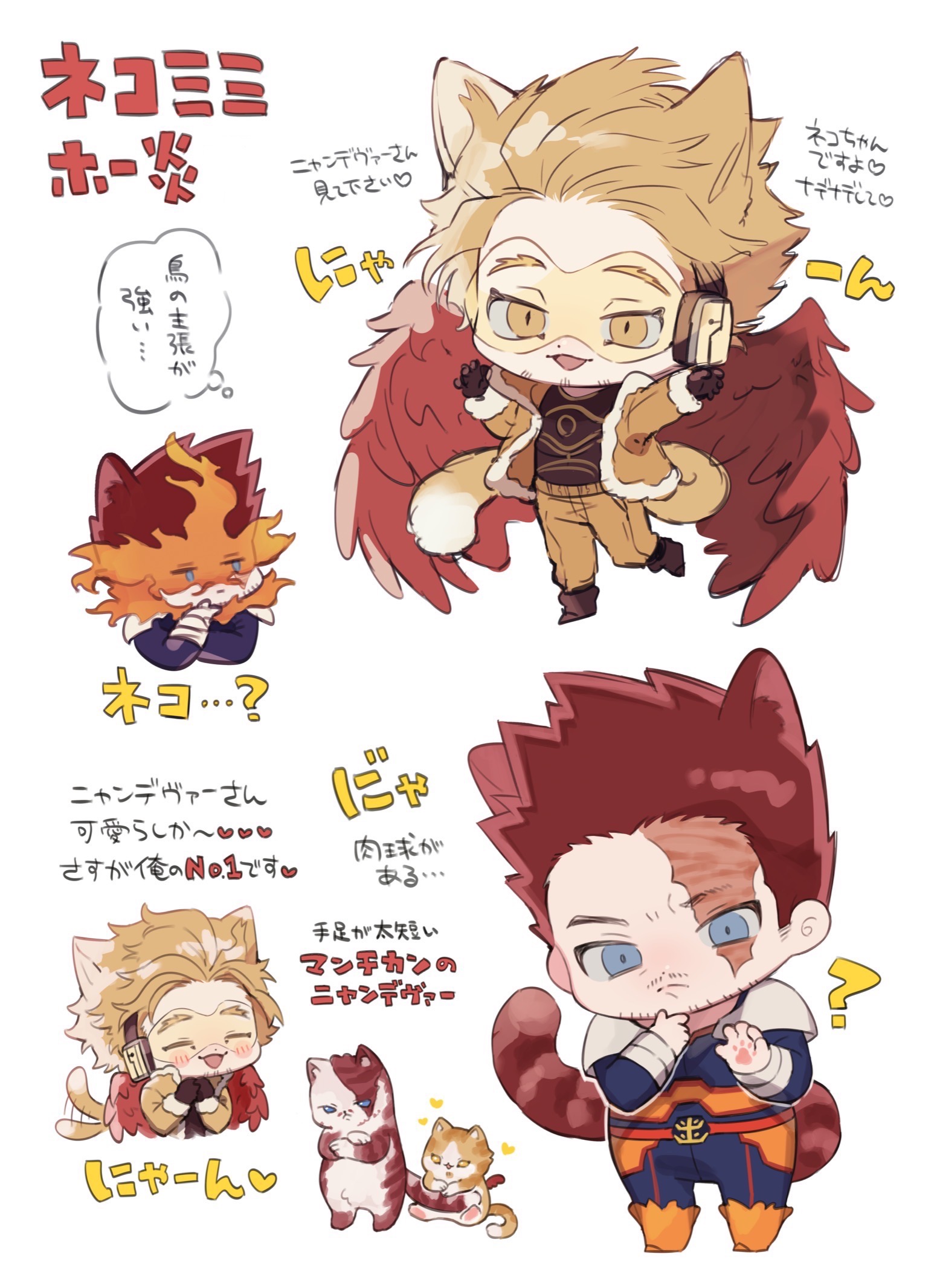 2boys animal_ears animalization black_gloves black_shirt blue_bodysuit blue_eyes bodysuit boku_no_hero_academia brown_jacket cat_ears cat_tail endeavor_(boku_no_hero_academia) facial_hair fire fur-trimmed_jacket fur_trim gloves goatee_stubble hawks_(boku_no_hero_academia) headphones highres jacket kemonomimi_mode long_sleeves male_focus mentosucyan multiple_boys mustache_stubble open_mouth pyrokinesis red_wings shirt sparse_stubble stubble tail tail_wagging white_background wings
