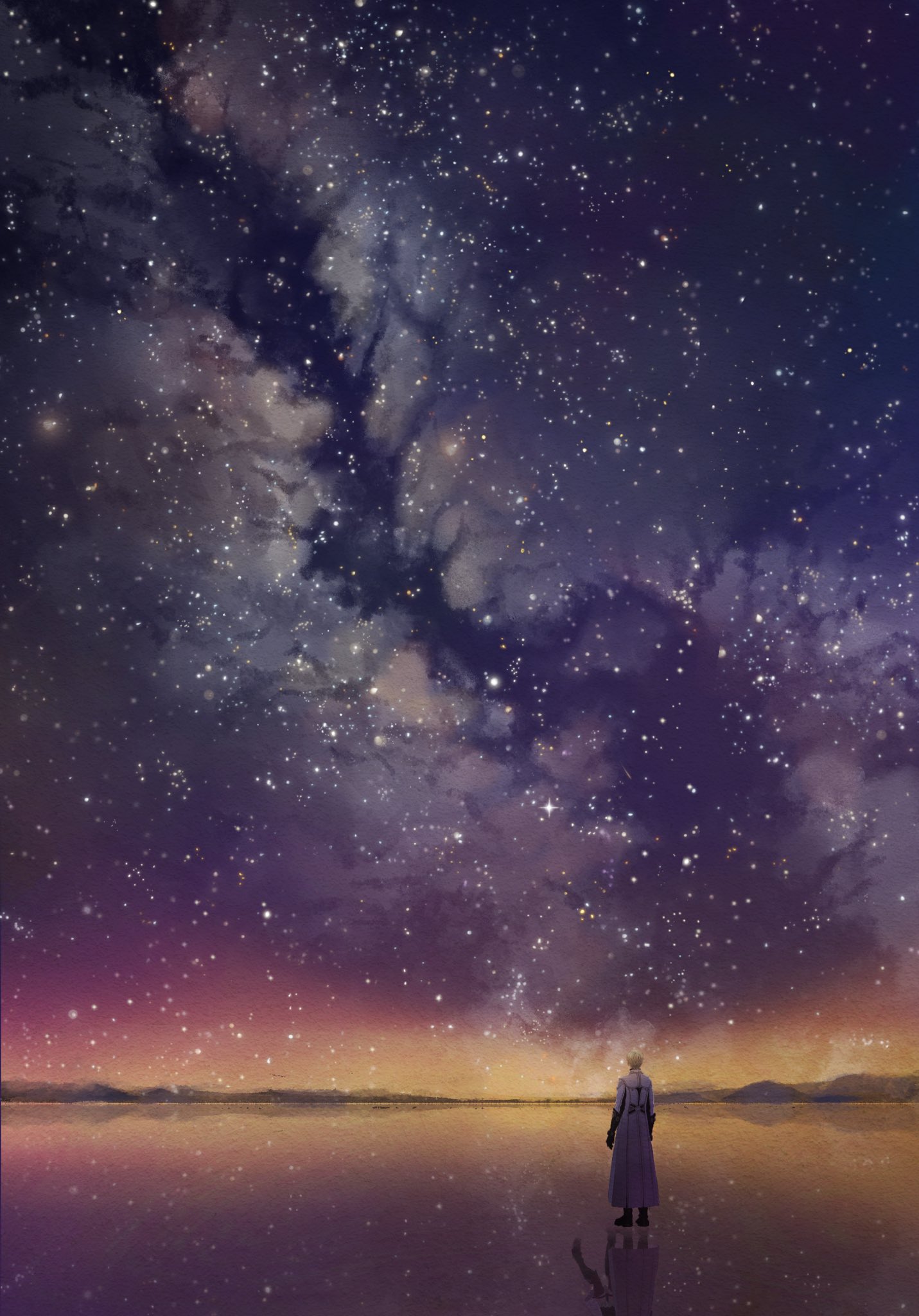 1boy 1girl black_boots black_gloves boots coat different_reflection facing_away from_behind full_body gloves grey_hair hachicohhh highres long_coat love_and_deepspace male_focus milky_way night protagonist_(love_and_deepspace) reflection short_hair sky star_(sky) starry_sky white_coat xavier_(love_and_deepspace)