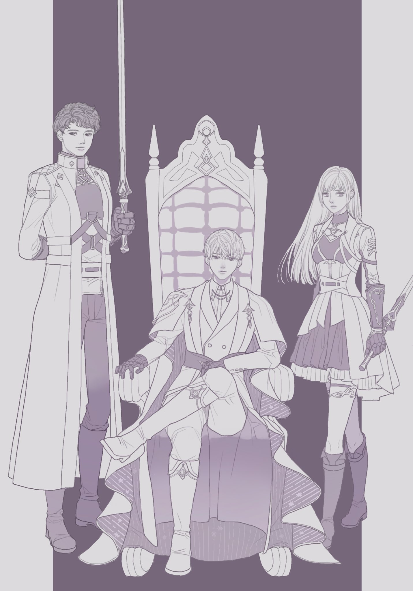1girl 2boys arm_behind_back armor armored_dress armored_gloves boots breasts closed_mouth crossed_legs dress full_body greyscale hachicohhh hair_between_eyes highres jacket jeremiah_(love_and_deepspace) long_coat long_hair love_and_deepspace medium_breasts monochrome multiple_boys pillarboxed protagonist_(love_and_deepspace) short_hair sitting standing throne white_jacket xavier_(love_and_deepspace)
