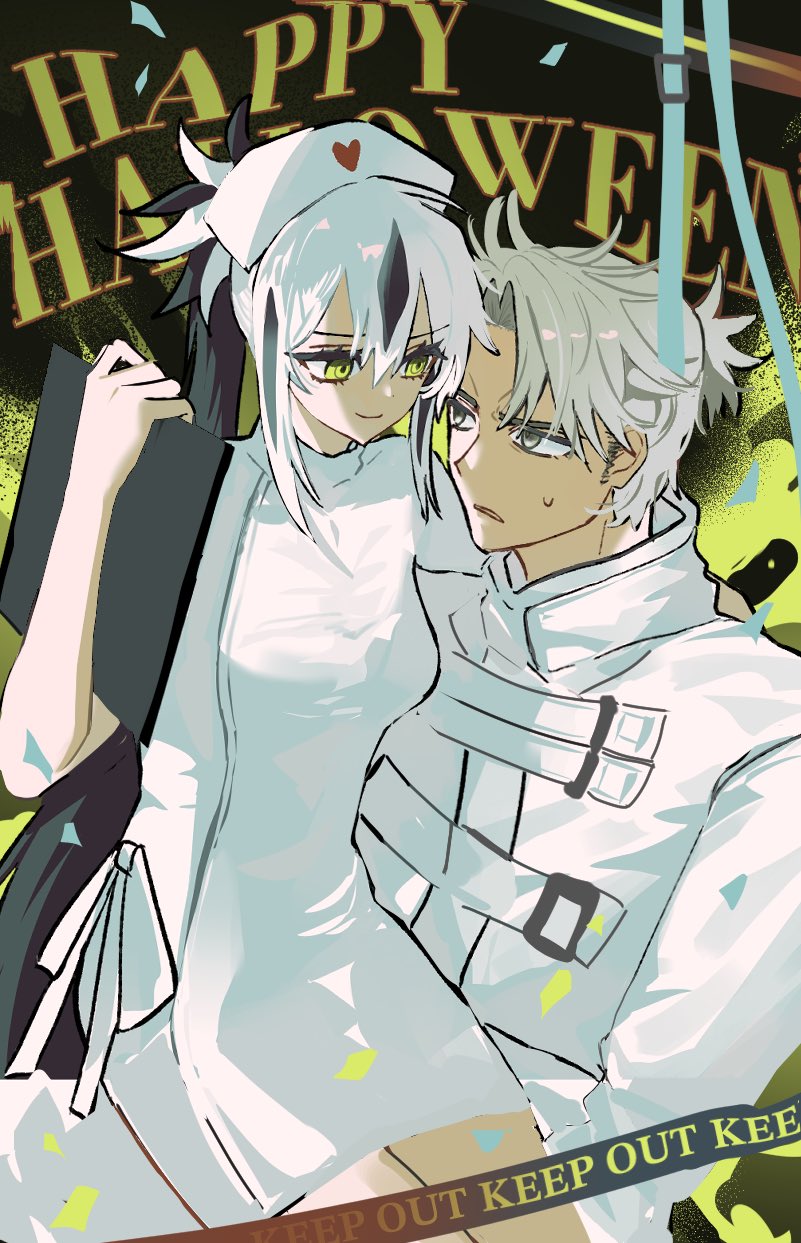 1boy 1girl black_hair closed_mouth fate/grand_order fate_(series) green_eyes grey_eyes grey_hair happy_halloween hat heart highres holding holding_board looking_at_another multicolored_hair nagao_kagetora_(fate) nurse nurse_cap parted_lips sidelocks sitting sitting_on_lap sitting_on_person smile ssmyow straitjacket streaked_hair sweatdrop takeda_shingen_(fate) two-tone_hair white_hair