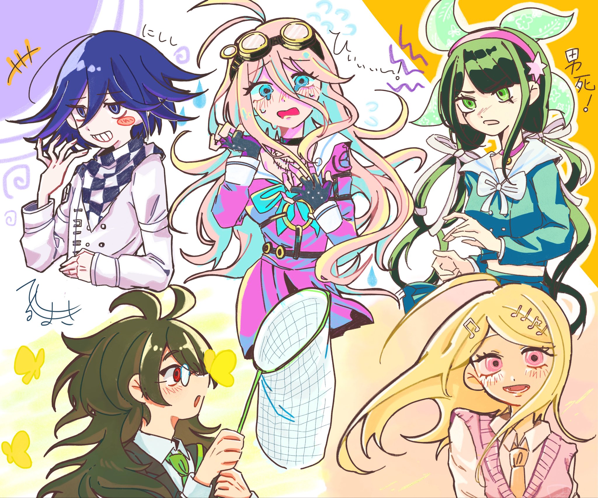2boys 3girls ahoge akamatsu_kaede antenna_hair barbed_wire belt black_hair blonde_hair blush blush_stickers bow bowtie brown_jacket butterfly_net buttons chabashira_tenko checkered_clothes checkered_scarf choker collared_shirt commentary_request cropped_torso danganronpa_(series) danganronpa_v3:_killing_harmony eyelashes fingerless_gloves flipped_hair fortissimo glasses gloves goggles goggles_on_head gokuhara_gonta green_eyes grin hair_between_eyes hair_ornament hair_ribbon hairband hand_net heru_maki highres iruma_miu jacket long_hair long_sleeves looking_at_viewer low_twintails messy_hair multiple_belts multiple_boys multiple_girls musical_note musical_note_hair_ornament necktie o-ring o-ring_belt oma_kokichi open_mouth orange_necktie outline pink_choker pink_hairband pink_serafuku pink_shirt pink_sweater_vest purple_eyes purple_hair red_eyes ribbon round_eyewear sailor_collar scarf school_uniform serafuku shirt short_hair skirt smile sweater_vest tearing_up teeth twintails two-tone_scarf upper_body very_long_hair white_bow white_bowtie white_outline white_shirt