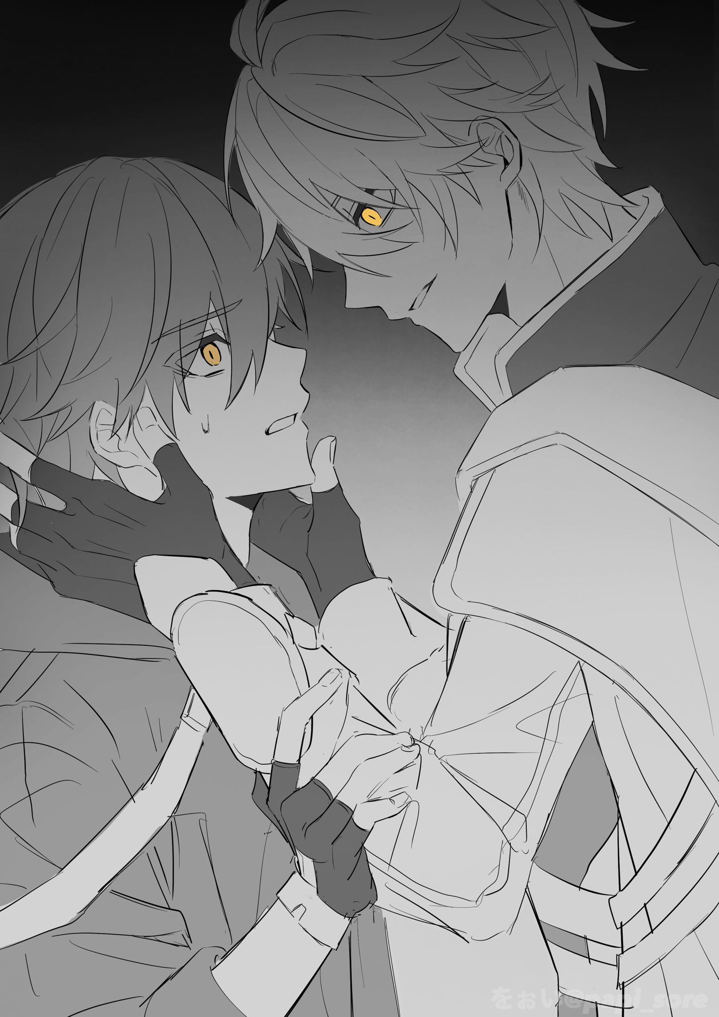 2boys antenna_hair arm_armor caelus_(honkai:_star_rail) cape fingerless_gloves fingernails gloves gradient_background greyscale hair_between_eyes hands_up highres honkai:_star_rail honkai_(series) hood hooded_coat jacket long_sleeves looking_at_another male_focus male_yandere monochrome multiple_boys nervous orange_eyes papi_sore phainon_(honkai:_star_rail) short_hair simple_background smile standing sweatdrop trailblazer_(honkai:_star_rail) yandere yaoi yellow_eyes