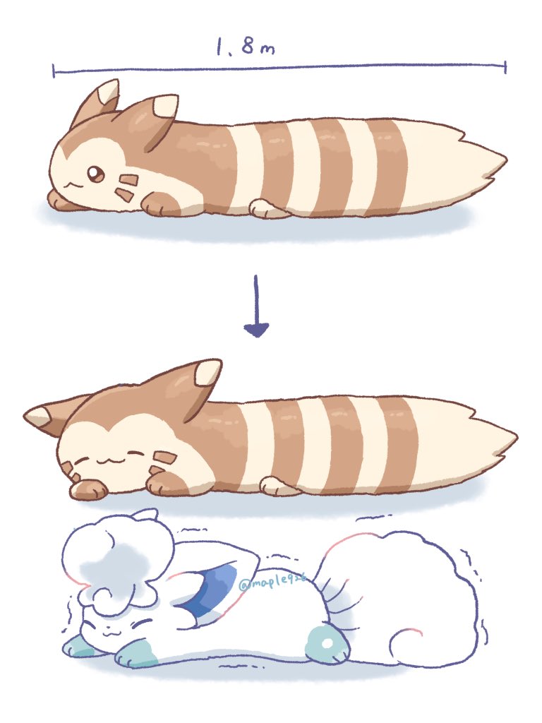:3 alolan_form alolan_vulpix animal_focus arrow_(symbol) brown_eyes brown_fur closed_eyes closed_mouth fox full_body furret gen_2_pokemon gen_7_pokemon kana_(maple926) nintendo no_humans pokemon pokemon_(creature) pokemon_focus smile stretching tail white_fur