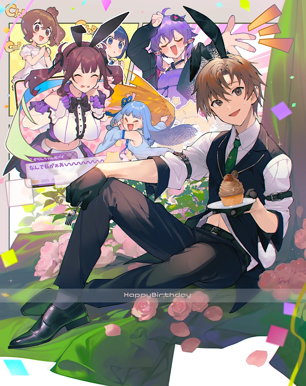 >_< 1boy 5girls :d ^_^ animal_ear_hairband animal_ears arm_belt belt belt_buckle black_gloves black_hairband black_pants black_shoes black_vest blue_eyes blue_hair blush brown_eyes brown_hair buckle cevio closed_eyes collared_shirt commentary_request fake_animal_ears fork gloves green_necktie hairband happy_birthday highres holding holding_fork holding_tray kotonoha_aoi male_playboy_bunny midriff multiple_girls natsuki_karin navel necktie open_mouth pants purple_hair rabbit_ears satou_sasara shirinda_fureiru shirt shoes sitting smile solo_focus suzuki_tsudumi sweat synthesizer_v takahashi_amato tray vest vocaloid voiceroid white_shirt yuzuki_yukari