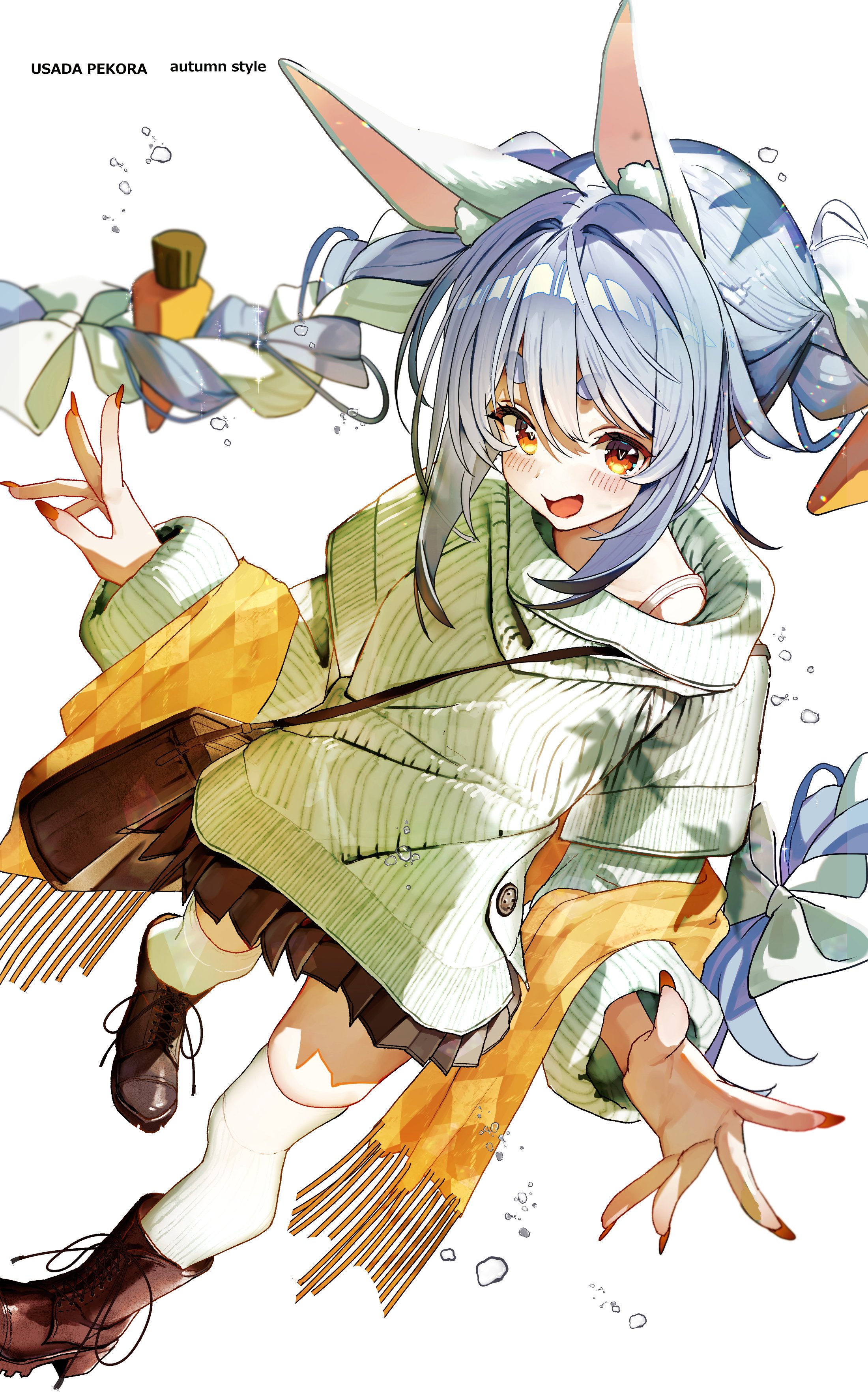 1girl absurdres alternate_costume animal_ears bag blue_hair blush boots braid carrot_hair_ornament food-themed_hair_ornament green_sweater hair_ornament haruhina_purple highres hololive long_hair long_sleeves looking_at_viewer multicolored_hair open_mouth orange_eyes orange_nails pleated_skirt rabbit_ears simple_background skirt smile solo sweater thick_eyebrows thighhighs twin_braids usada_pekora virtual_youtuber white_background white_hair white_thighhighs