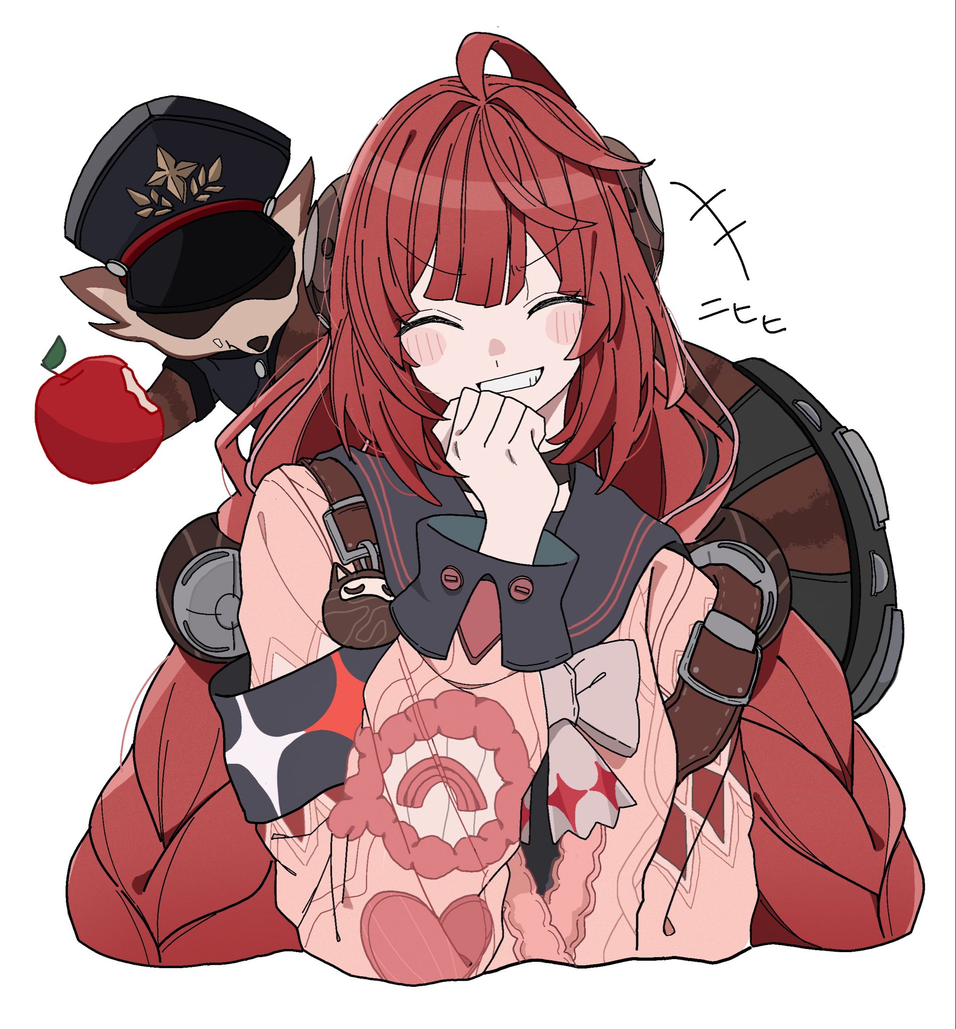 1girl 1other animal animal_on_back apple armband backpack bag black_hat black_sailor_collar blush braid braided_twintails cardigan charm_(object) chest_bow clenched_hand closed_eyes commentary_request covering_own_mouth food fruit hair_ornament hat hearing_aid highres holding holding_food holding_fruit kamanosuke_(zenless_zone_zero) laughing long_hair niupum pink_cardigan raccoon red_hair sailor_collar simple_background smile sphere_hair_ornament tanuki teeth ukinami_yuzuha upper_body white_background zenless_zone_zero