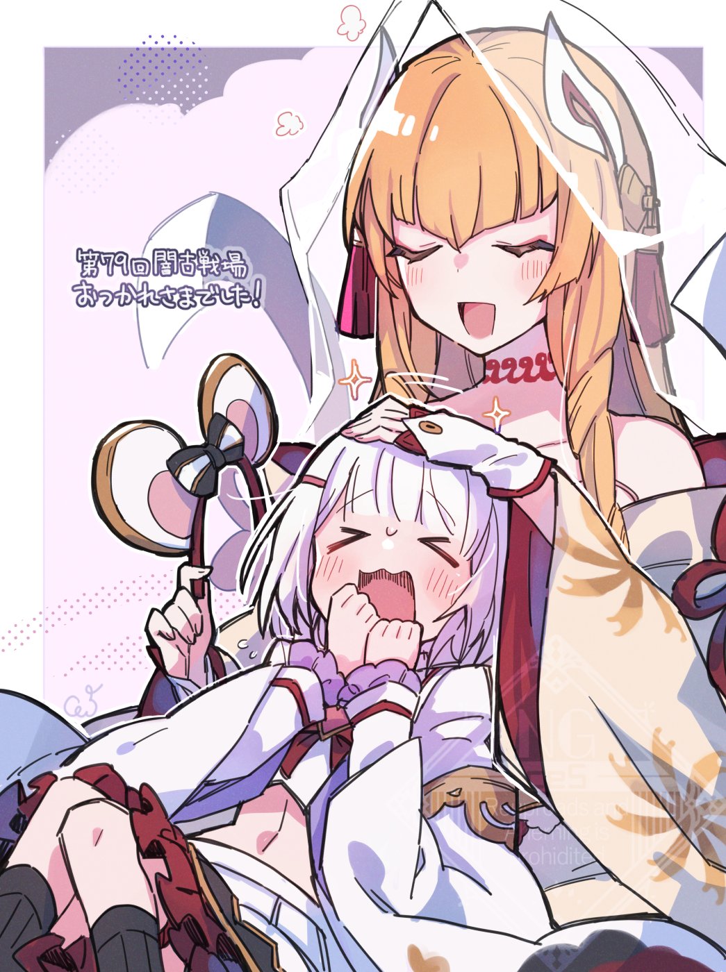 >_< 2girls animal_ears blonde_hair blush closed_eyes dress fake_animal_ears flying_sweatdrops gb_cestus granblue_fantasy headpat highres indala_(granblue_fantasy) japanese_clothes mouse_ears multiple_girls open_mouth skirt sparkle strapless strapless_dress vikala_(granblue_fantasy) watermark white_hair