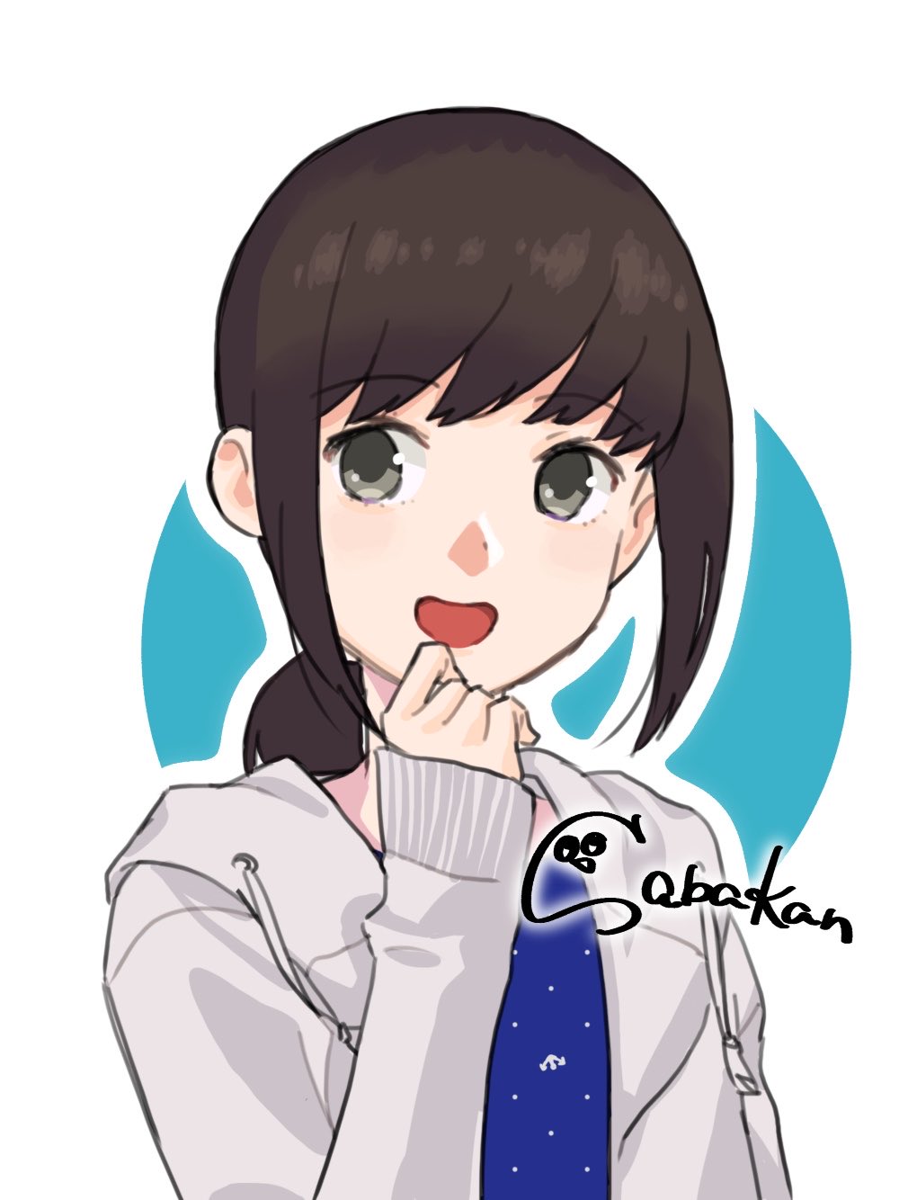1girl :d anchor_symbol blue_background blue_dress brown_hair commentary drawstring dress fubuki_(kancolle) fubuki_(spring)_(kancolle) grey_eyes grey_jacket hand_up highres hood hood_down hooded_jacket jacket kantai_collection long_sleeves looking_at_viewer low_ponytail medium_hair official_alternate_costume one-hour_drawing_challenge open_clothes open_jacket open_mouth outline polka_dot polka_dot_dress ponytail sabakanbasupisu sidelocks signature simple_background sleeves_past_wrists smile solo upper_body white_background white_outline