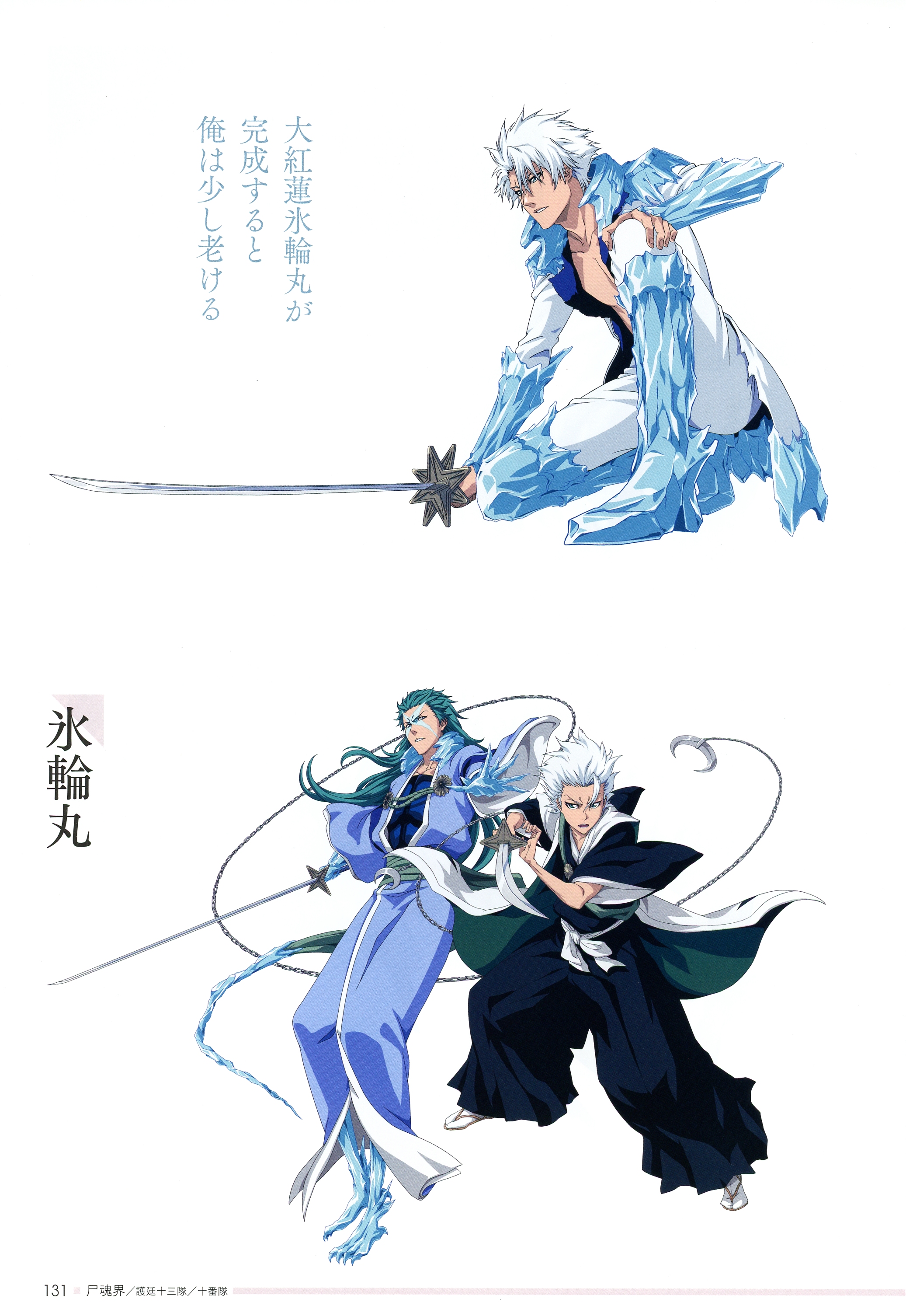 2boys absurdres alternate_form bleach bleach:_brave_souls bleach:_sennen_kessen-hen bleach:_zanpakutou_ibun_hen dark_skin from_side haori highres hitsugaya_toushirou hitsugaya_toushirou_(adult) holding holding_sword holding_weapon hyourinmaru ice japanese_clothes katana looking_at_viewer multiple_boys official_art scan serious shihakusho shikai socks spiked_hair sword taichou_haori translation_request weapon white_socks zanpakutou_(spirit)