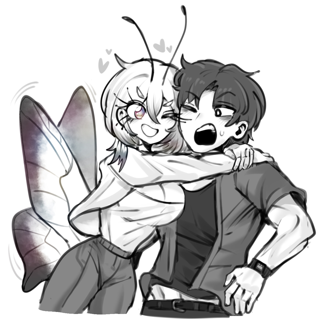 1girl :d antennae aqua_eyes arthropod_girl belt black_shirt blush breasts butterfly_girl butterfly_wings cleavage commentary_request embarrassed heart highres hug insect_wings jacket korean_commentary large_breasts long_eyelashes medium_breasts medium_hair monster_girl multicolored_eyes oligogi_meoggosipda one_eye_closed open_mouth original partially_colored pink_eyes shirt short_hair simple_background smile teeth upper_teeth_only watch white_background wings wristwatch
