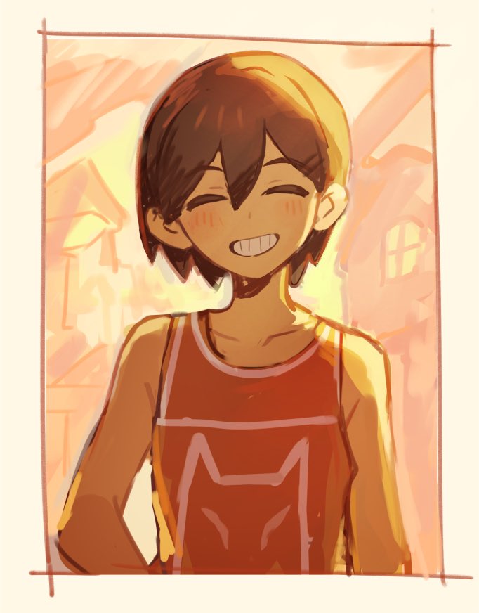 1boy :d ^_^ backlighting bare_arms bare_shoulders border brown_hair closed_eyes collarbone commentary_request dark-skinned_male dark_skin double-parted_bangs facing_viewer grin hair_behind_ear hair_between_eyes house kanyoko_(yuzukano_17) kel_(faraway)_(omori) kel_(omori) male_focus omori open_mouth orange_tank_top outdoors short_hair simple_background sky smile solo straight-on tank_top upper_body window yellow_border yellow_sky